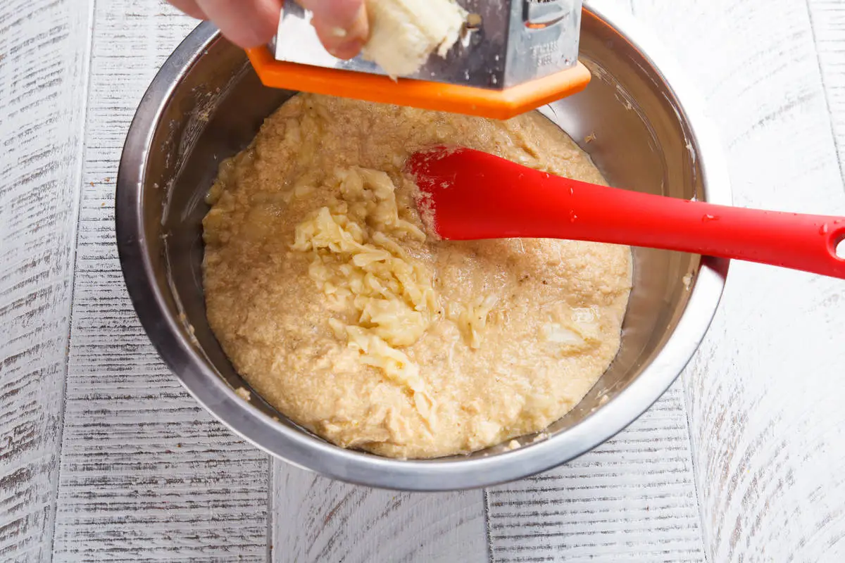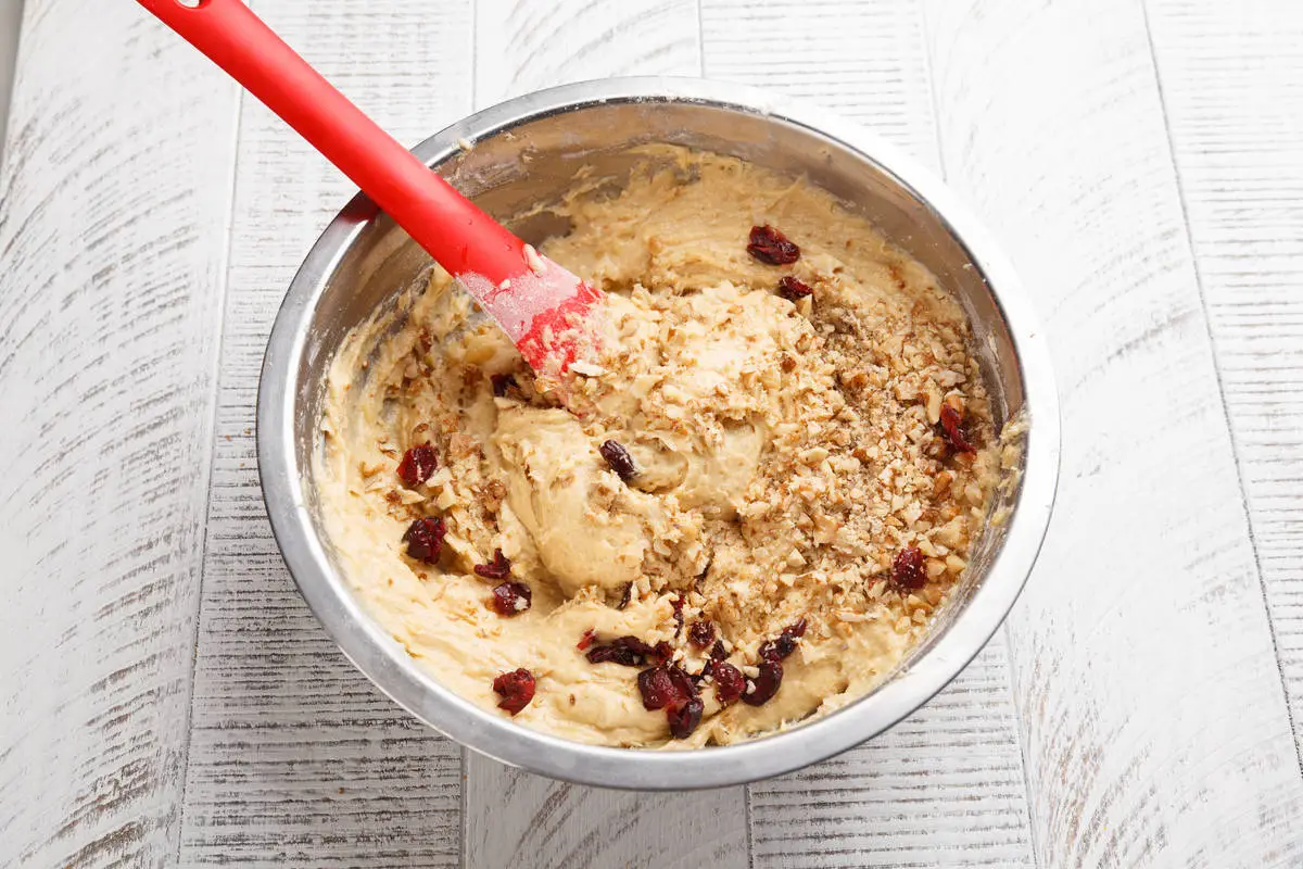 Добавьте измельчённые на тёрке или размятые при помощи вилки бананы, клюкву, цедру апельсина, муку и разрыхлитель, аккуратно перемешайте тесто.