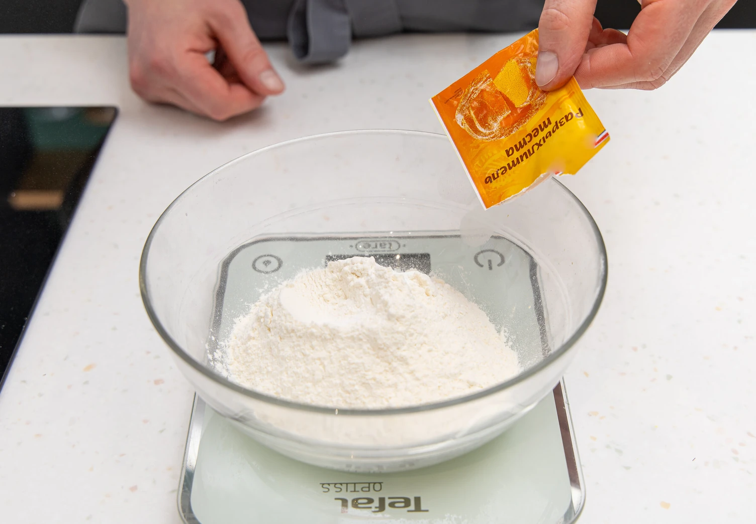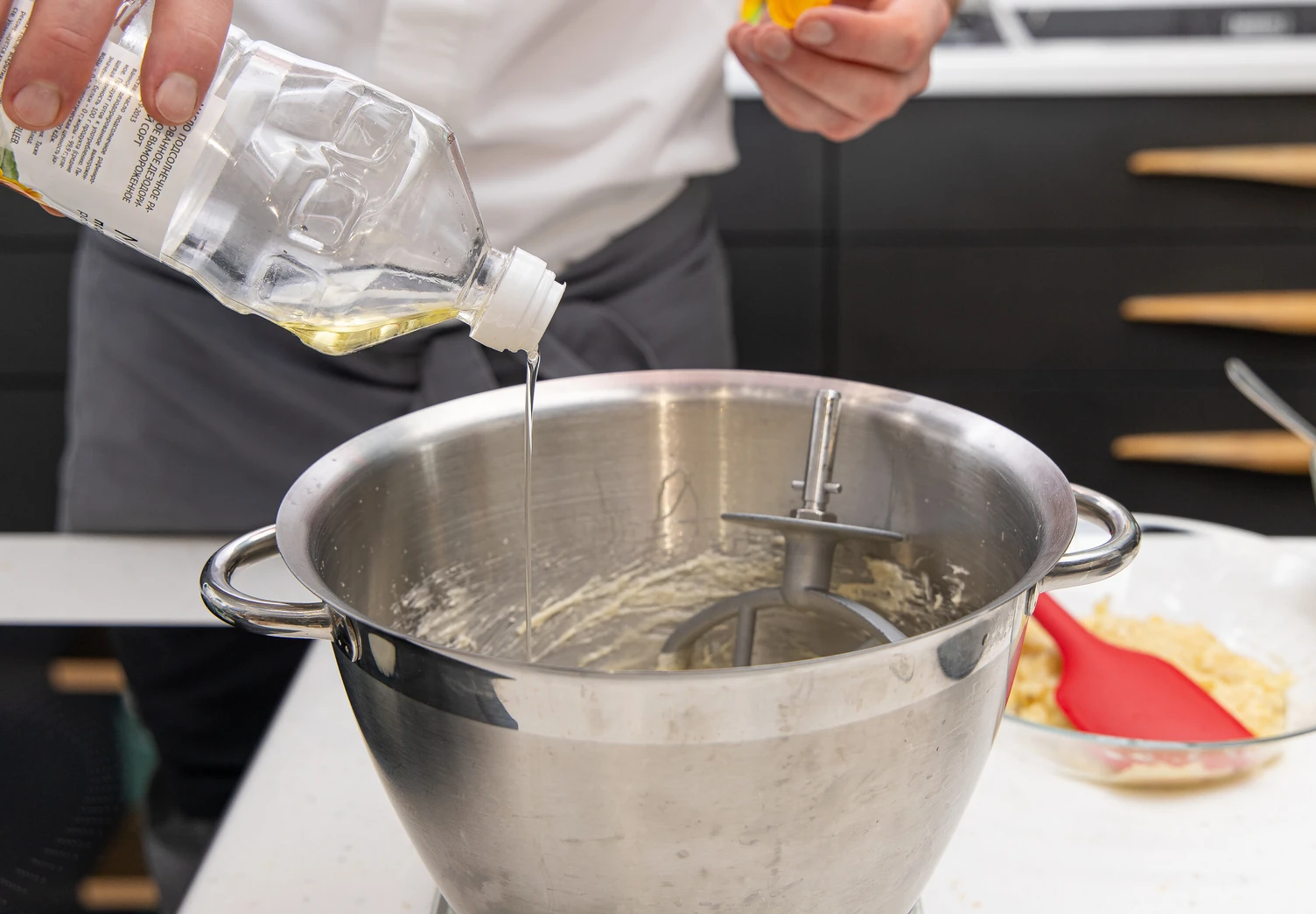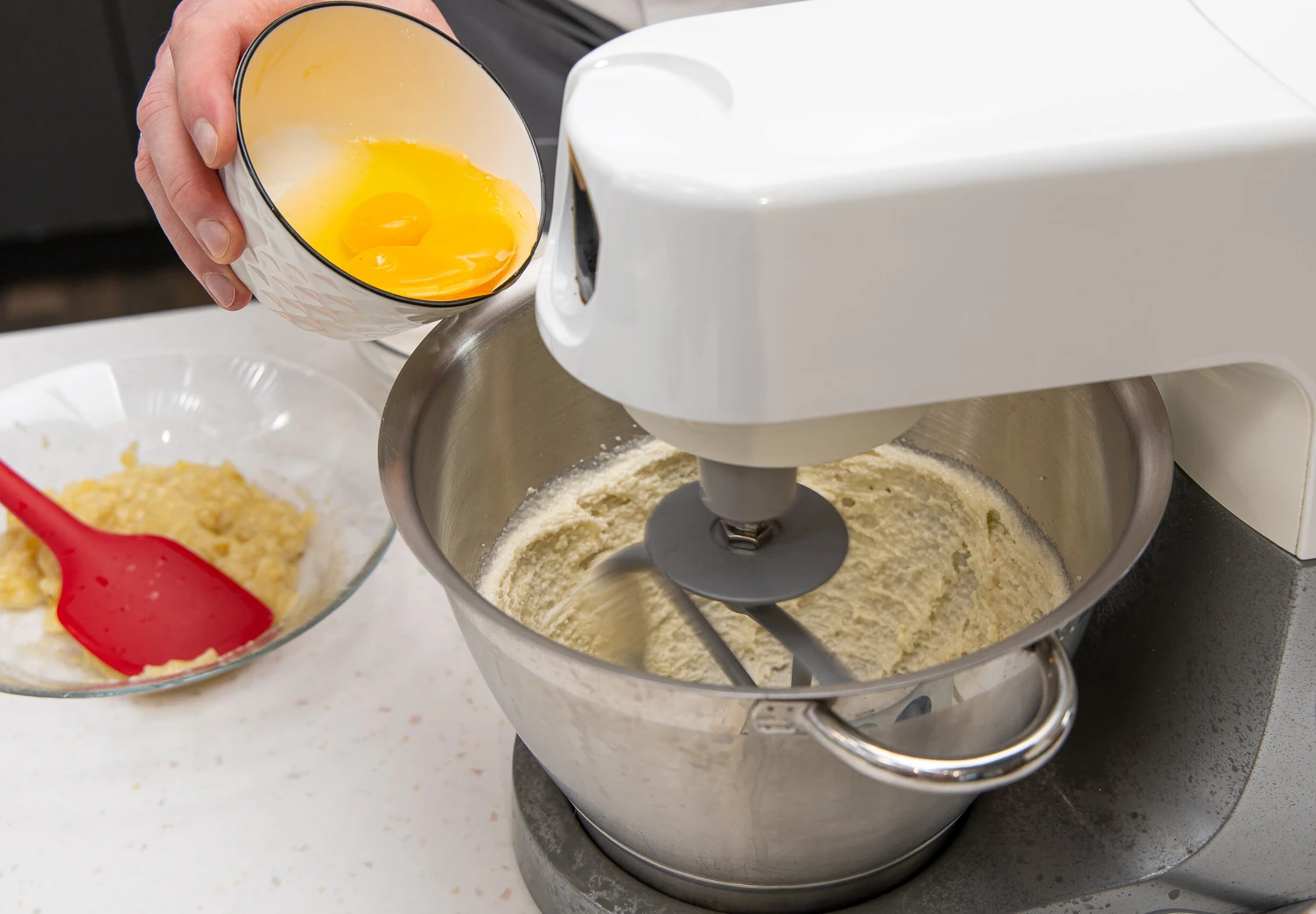 Муку смешайте с содой, разрыхлителем и солью. Подмешайте примерно половину сыпучих ингредиентов к яично-масляной массе.