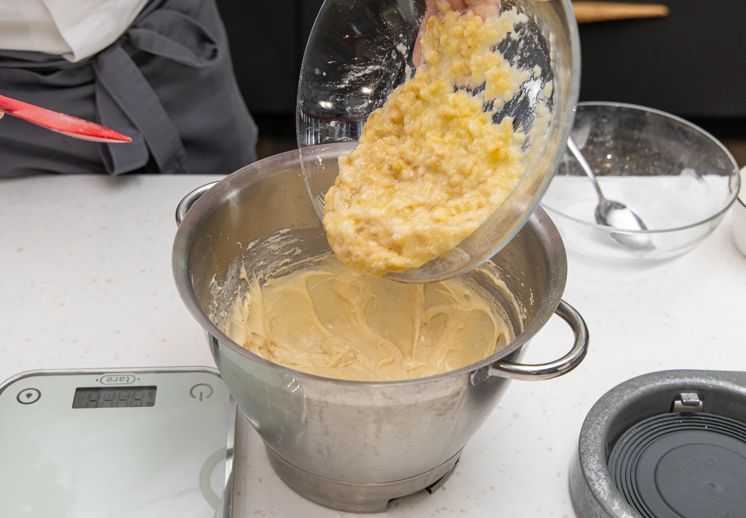 Добавьте размятые вилкой бананы и остаток мучной смеси.