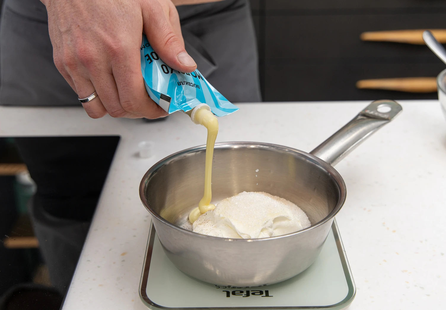 Для крема сложите в сотейнике все ингредиенты, кроме крем-чиза и сливочного масла. Поставьте смесь на средний огонь и нагревайте, постоянно помешивая, до заваривания. Охладите.
