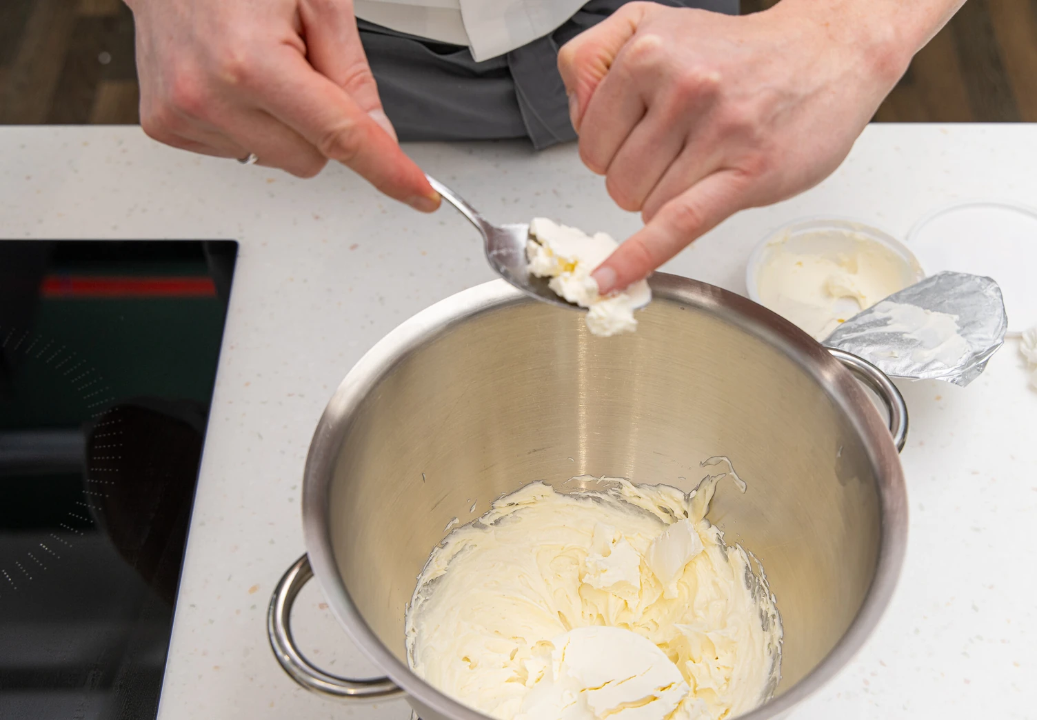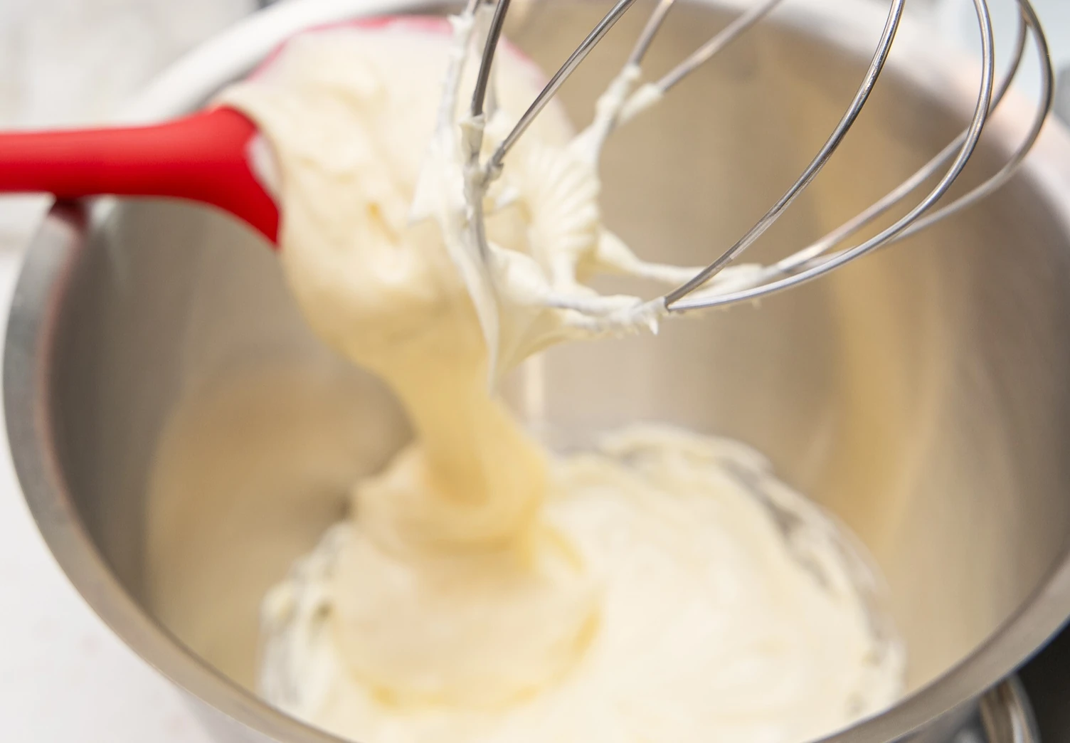 Добавьте крем-чиз и ещё раз быстро взбейте вместе. Не взбивайте крем долго, иначе он может расслоиться.