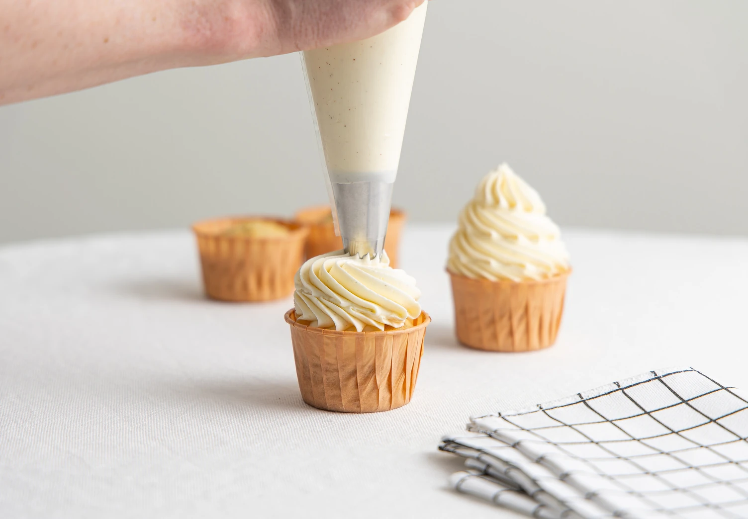 Переложите крем в кондитерский мешок с насадкой «звезда» и сделайте шапочки на остывших капкейках. По желанию украсьте жареными миндальными лепестками.