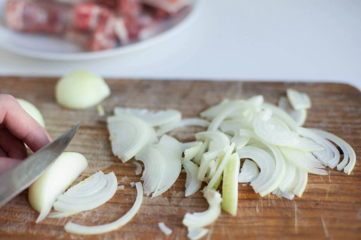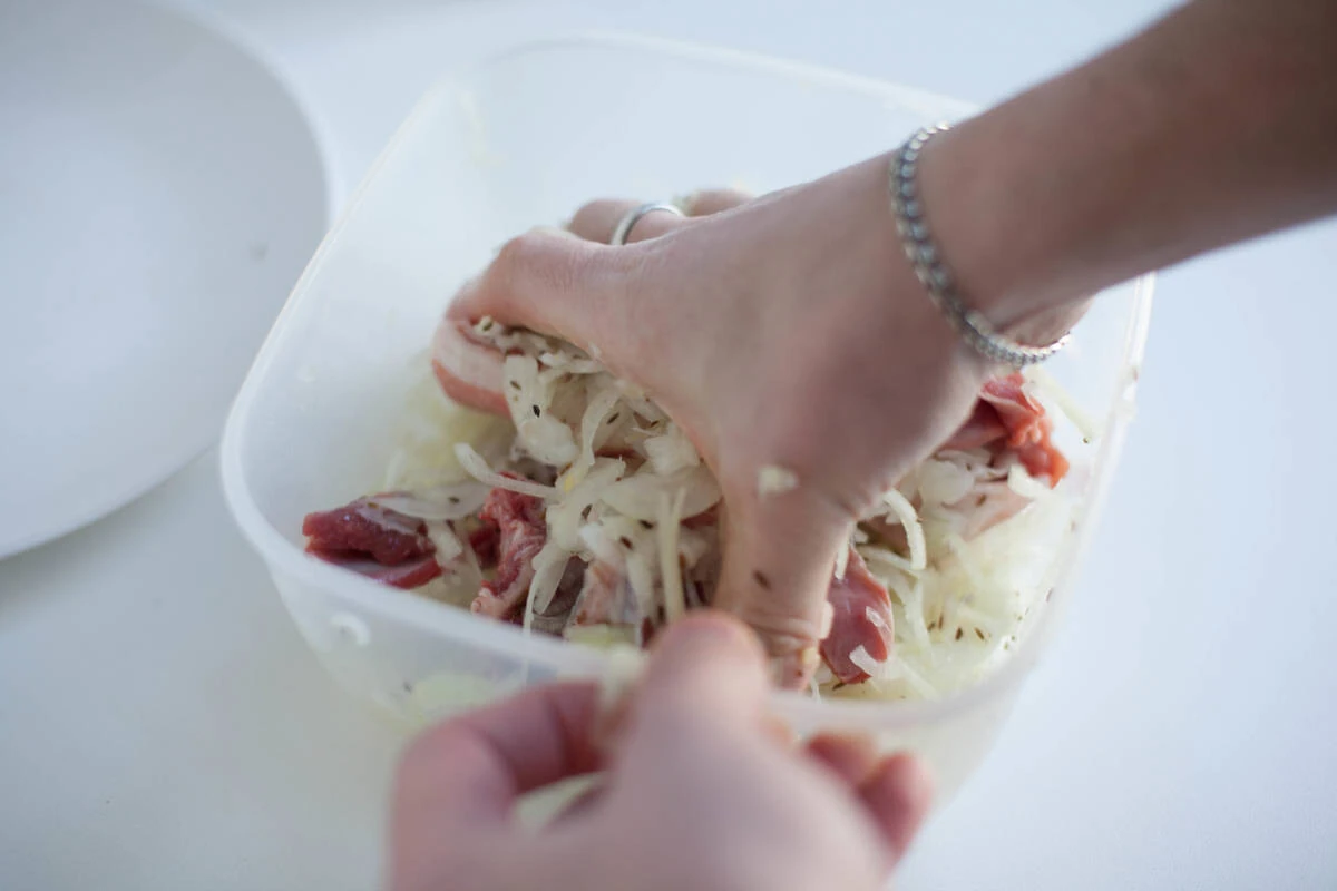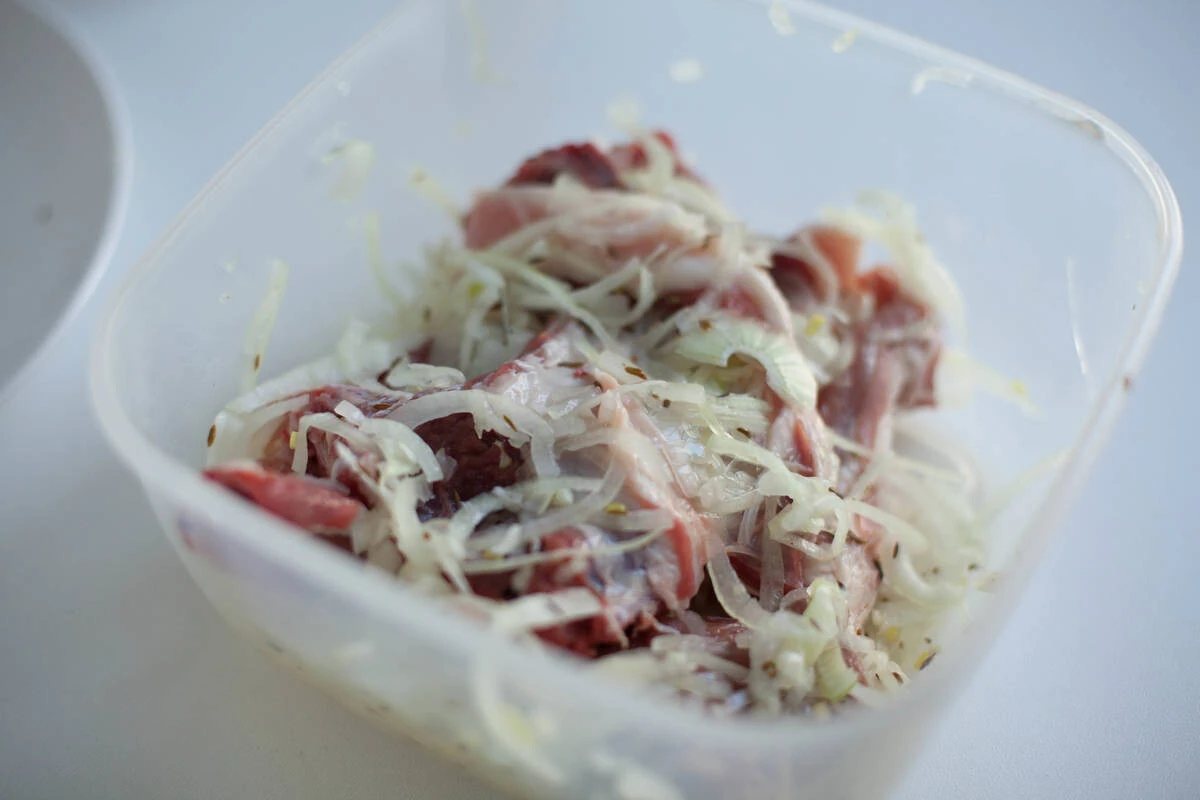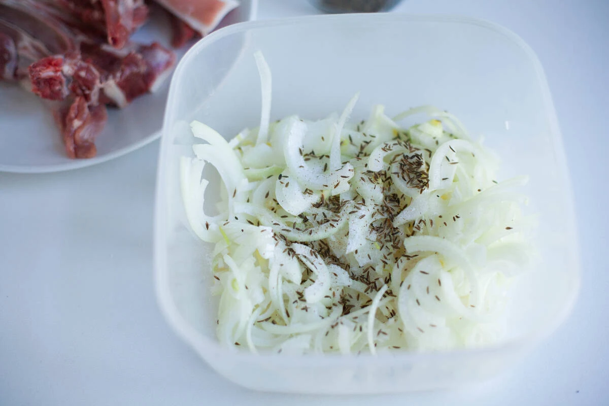Баранью корейку разрежьте на косточки, выложите к луку, перемешайте, закройте контейнер. Дальше можно заниматься мангалом, корейка должна мариноваться при комнатной температуре от получаса до двух часов.