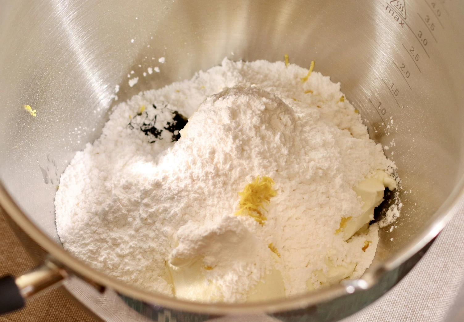 Соедините в миске творожный сыр, сахарную пудру и ванильную пасту. Тщательно перемешайте все ингредиенты до получения однородной массы.