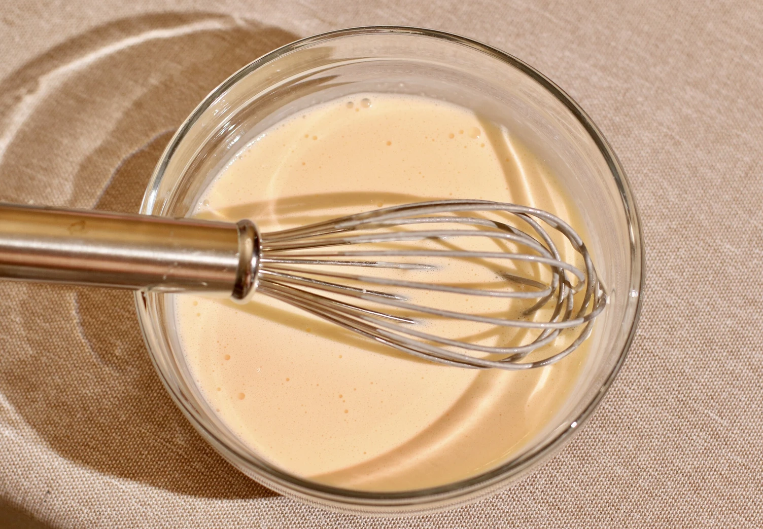 Во взбитые сливки добавьте яйца и кукурузный крахмал. Аккуратно перемешайте до однородности.
