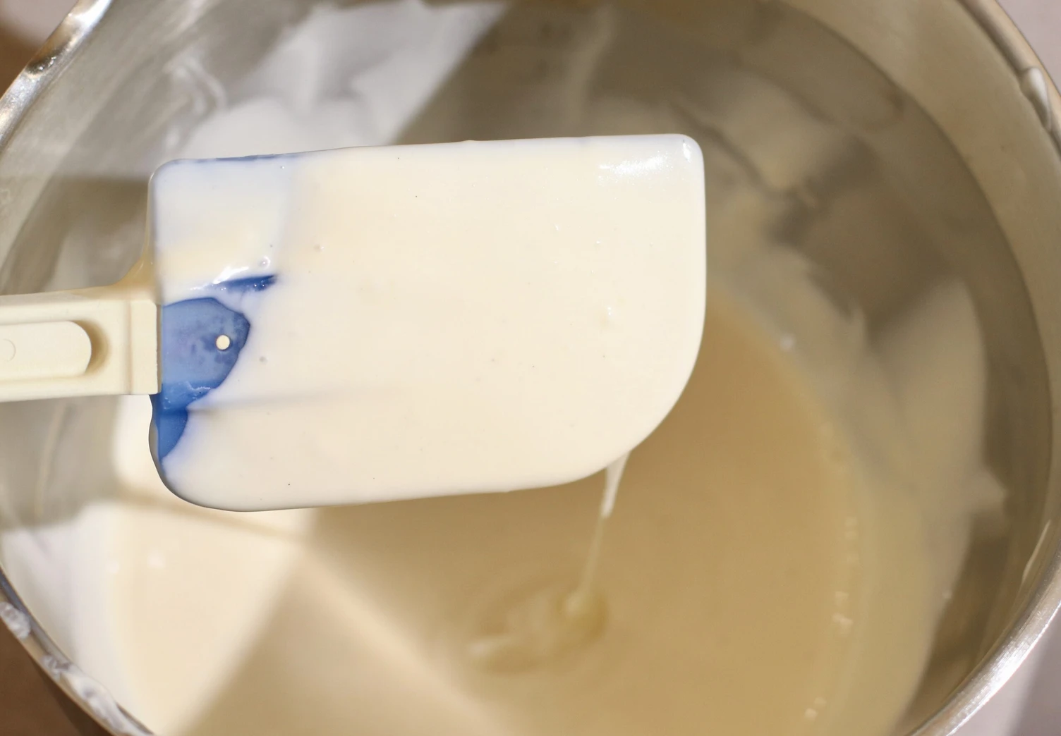 Порционно добавьте сливочную смесь в сырную основу, осторожно перемешивая каждый раз до полного соединения ингредиентов.