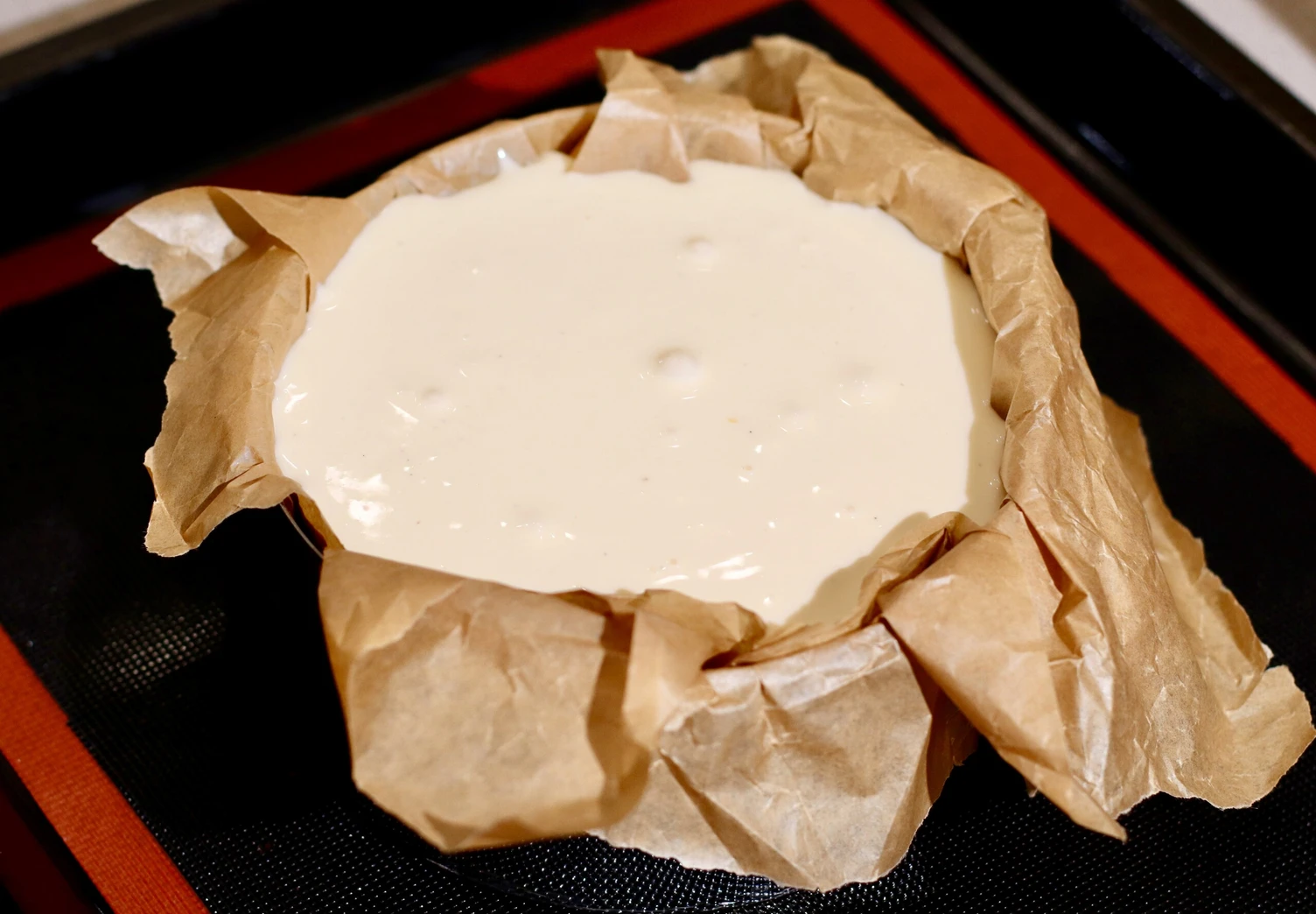 Подготовьте разъёмную форму для выпечки, выстелив ее дно двойным слоем пергамента. Вылейте получившуюся массу в форму и разровняйте поверхность.
