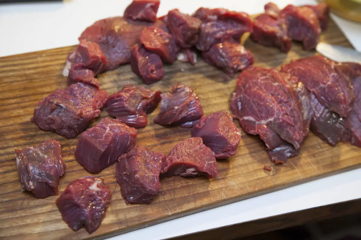 Вырезку нарежьте поперек волокон медальонами толщиной около 2 см, затем каждый кружок еще на 2-4 части, должны получиться аккуратные кубики.