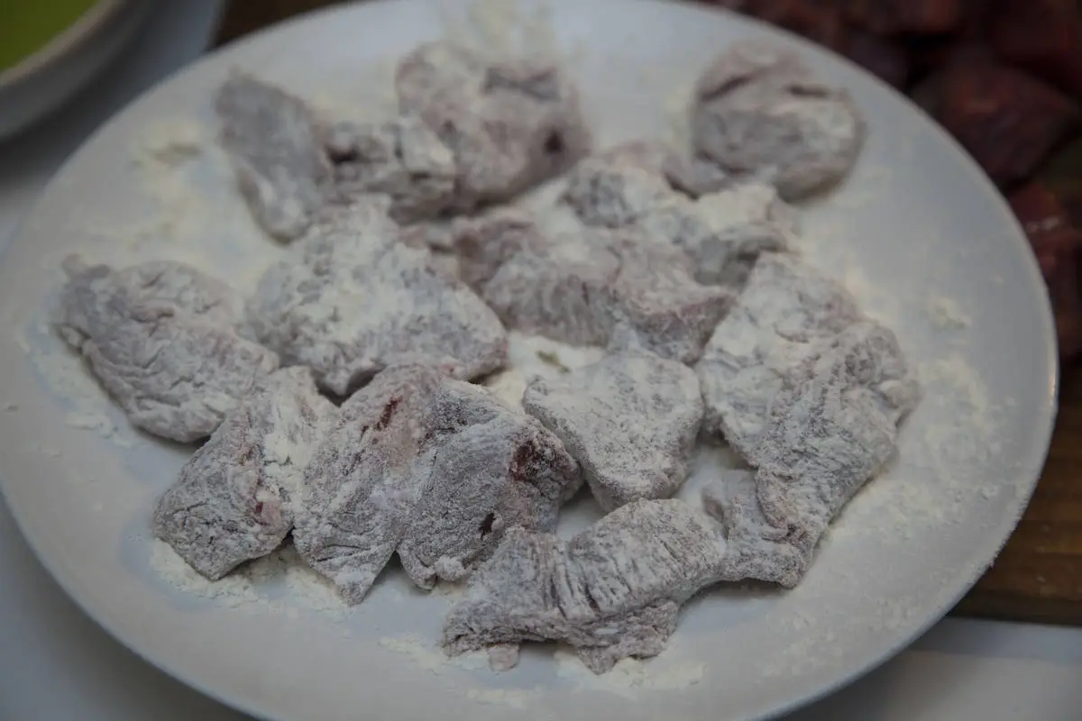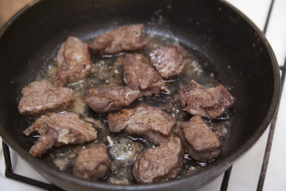 В большой сковороде разогрейте топленое масло, выкладывайте кусочки мяса так, чтобы оставался промежуток, обжаривайте на сильном огне по минуте с двух сторон.