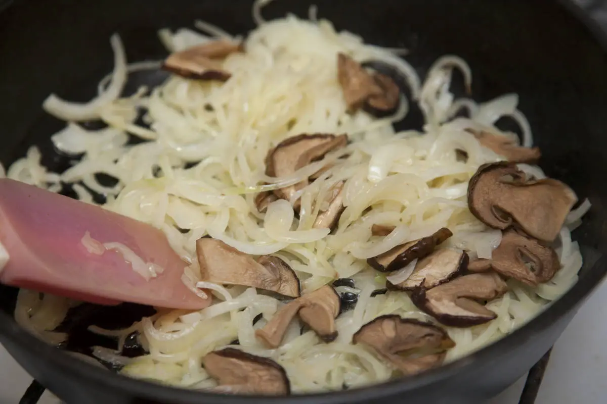Лук нарежьте тонкими полукольцами. Выложите мясо на тарелку, на оставшемся масле обжарьте лук до прозрачности, добавьте грибы, жарьте еще минуту.