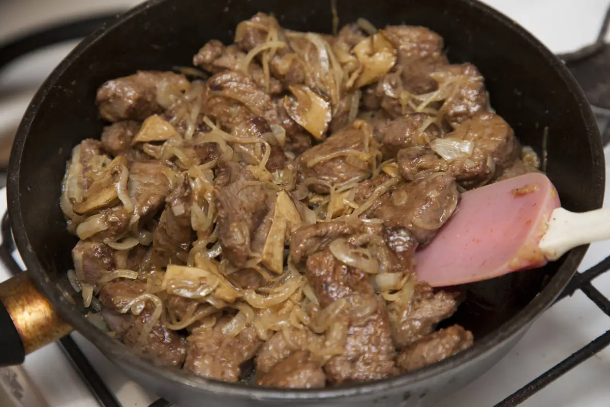 Затем выложите мясо в сковороду, влейте воду из-под грибов, посолите, поперчите, потомите еще 5 минут на среднем огне. В самом конце добавьте сметану, перемешайте и выключите огонь, накройте крышкой. Бефстроганов нельзя разогревать — сметана свернется, а нежная вырезка переготовится, поэтому для подачи к праздничному столу приготовьте заранее мясо, и обжарьте лук с грибами, просто соедините все перед подачей на стол и прогрейте, добавив в конце сметану. Подавайте бефстроганов с нежным картофельным пюре.