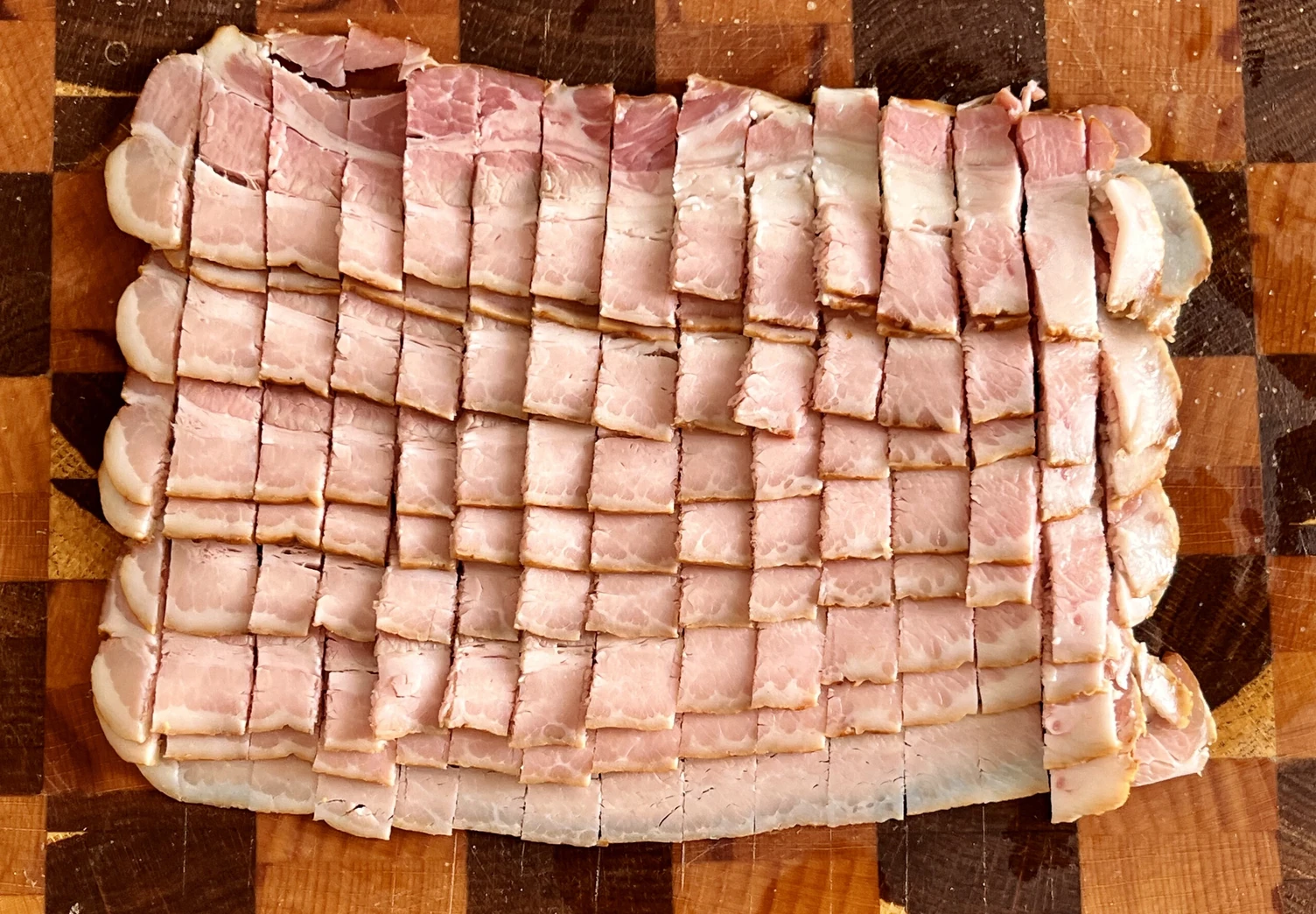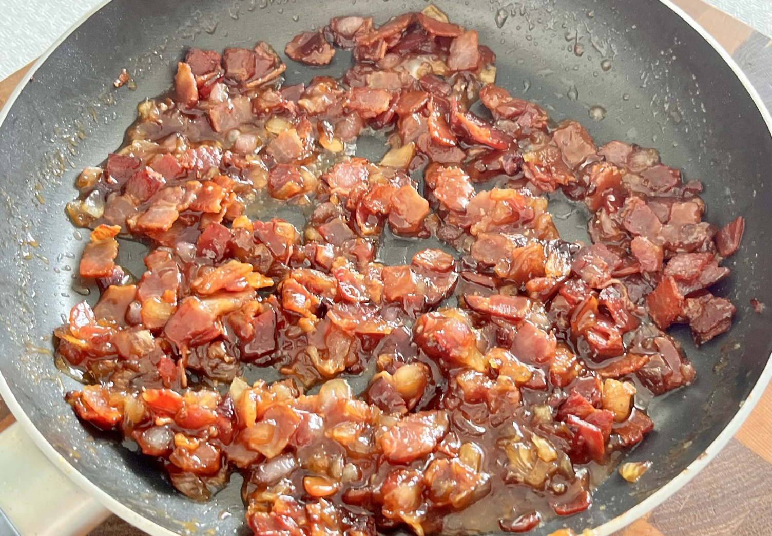 Разогрейте сковороду на сильном огне и выложите на неё бекон. Жарьте около 10 минут до выраженной коричневой корочки.