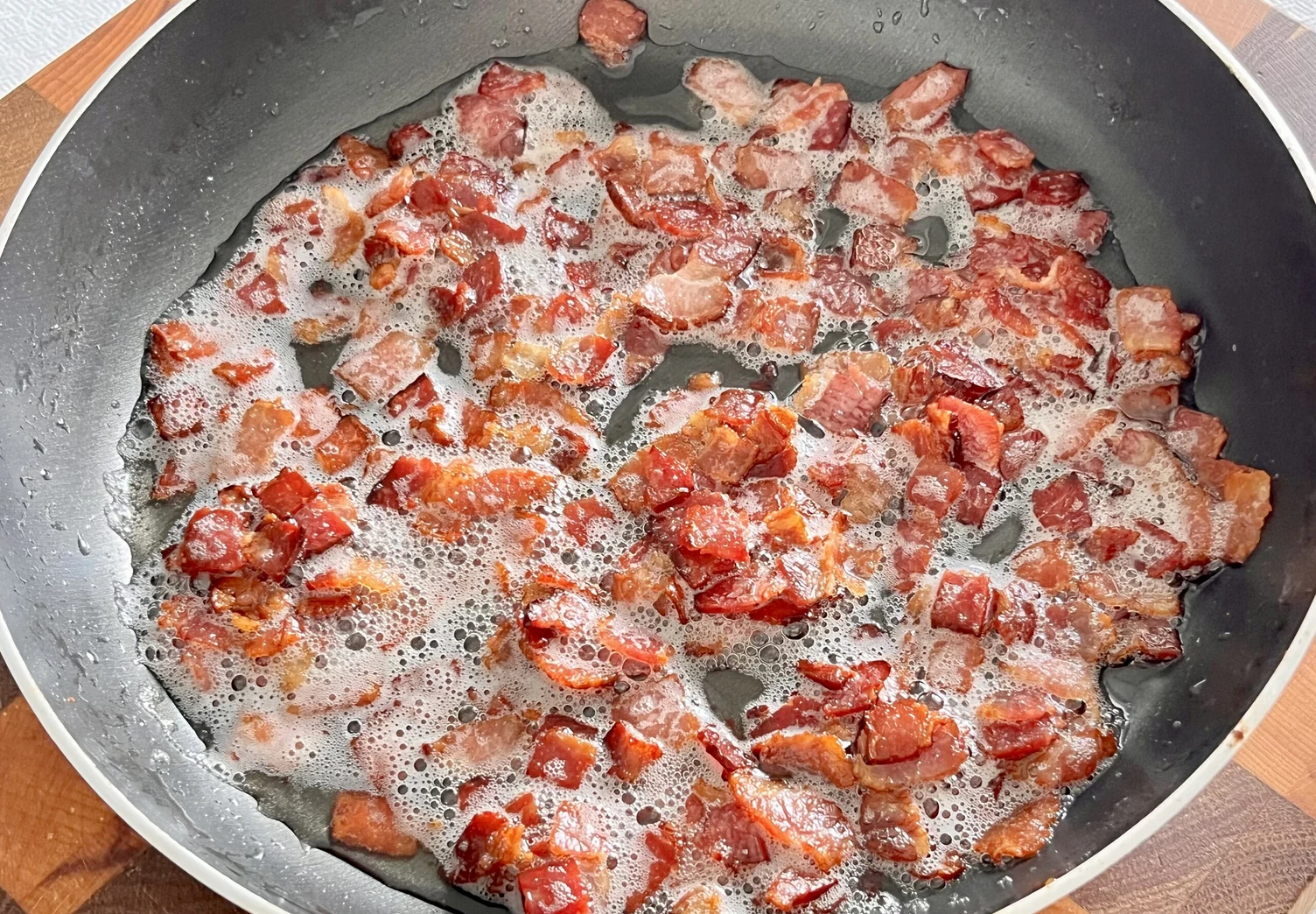 Когда бекон станет хрустящим, переложите его в отдельную ёмкость, оставив жир в сковороде.