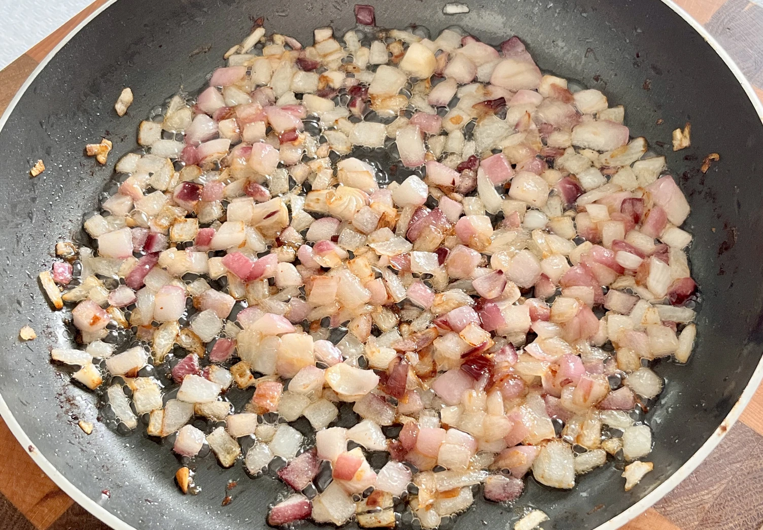 Нарежьте репчатый и ялтинский лук средним кубиком. Выложите лук в сковороду с жиром, оставшимся после бекона, и жарьте 14–16 минут на среднем огне до карамелизации лука.