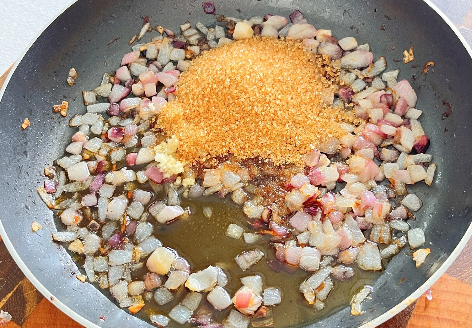 После того, как лук карамелизовался, добавьте в него тёртый чеснок, сахар и кленовый сироп. Убавьте огонь до слабого и жарьте ещё 8 минут, пока масса не будет похожа на джем.