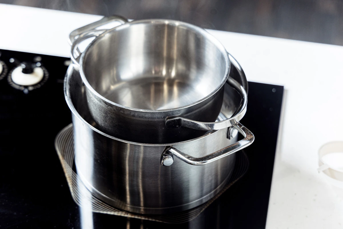 Для водяной бани подберите две ёмкости (миски или кастрюли) так, чтобы дно верхней чаши не касалось дна нижней. В нижней вода не должна кипеть во избежание попадания брызг в верхнюю часть.