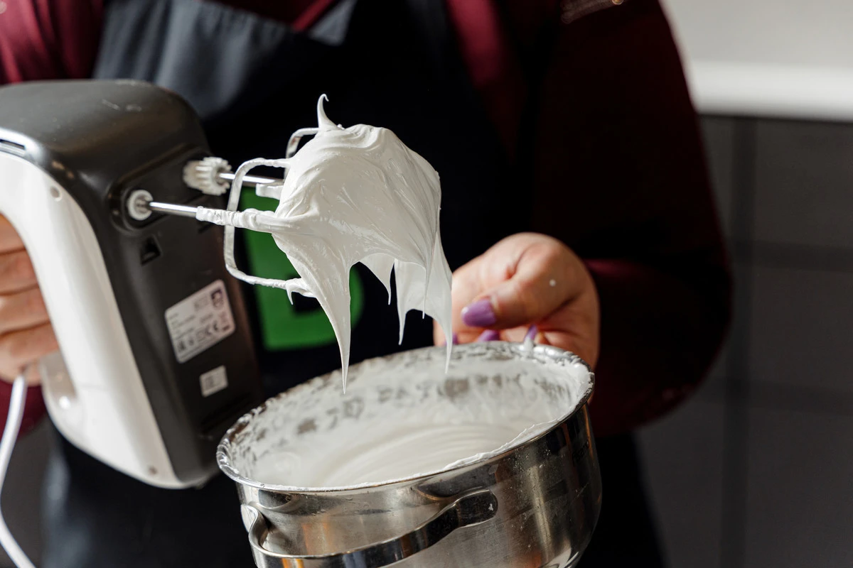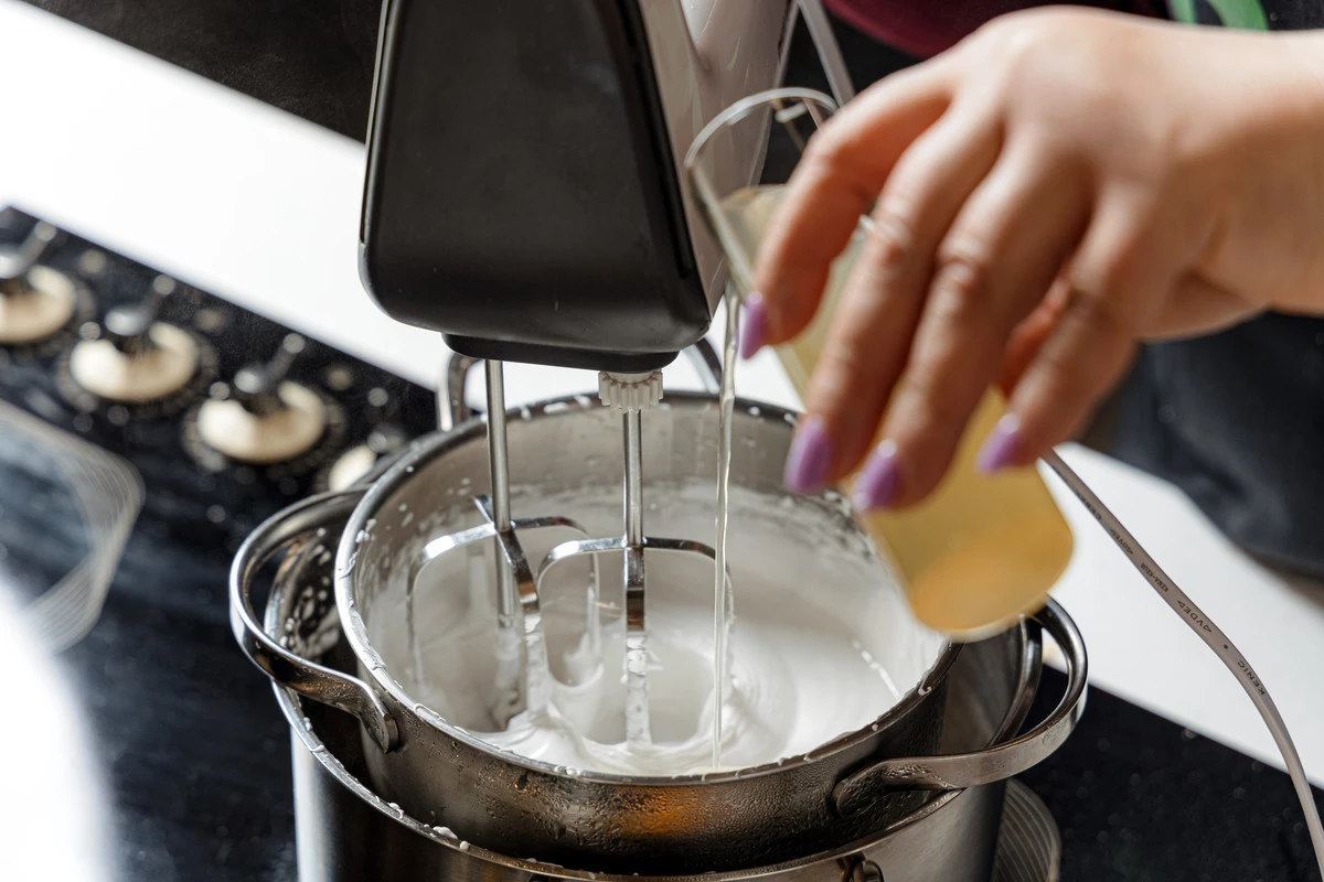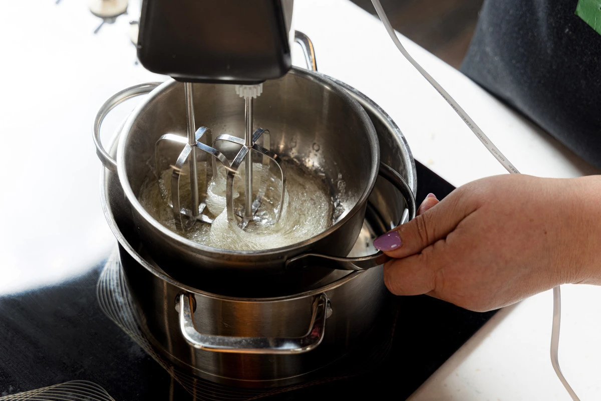Медленно всыпайте сахар, продолжая взбивать, переключите миксер на максимальную скорость, интенсивно взбивайте на водяной бане до устойчивых пиков.