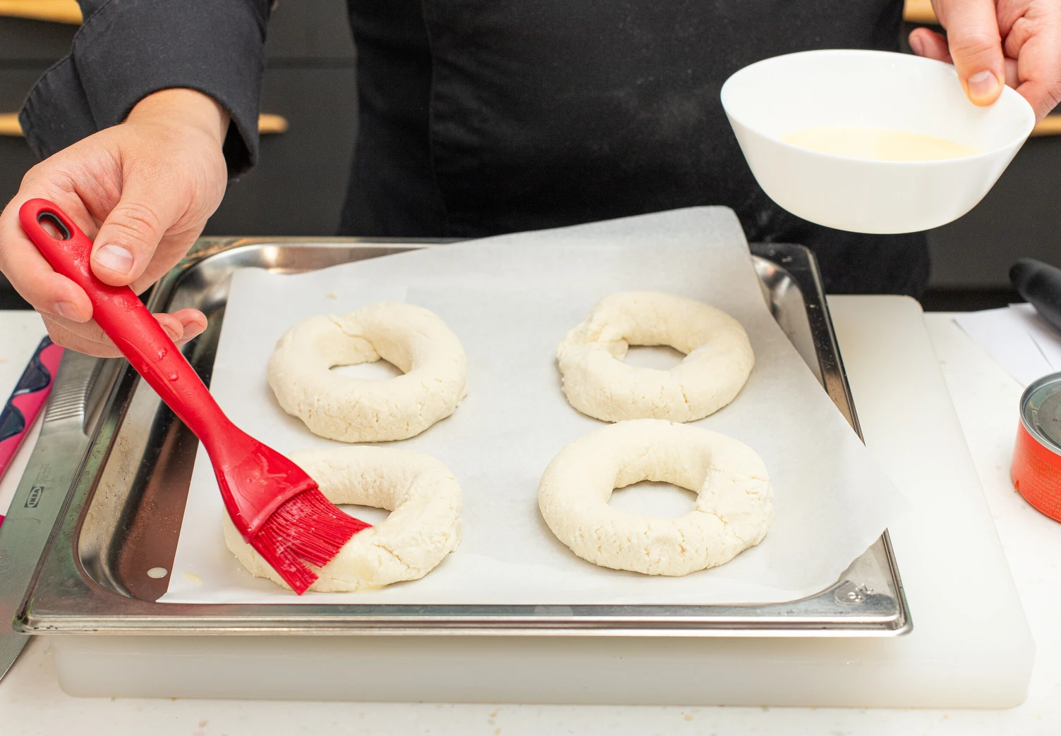 Положите тесто на рабочую поверхность и разделите на 8 частей. Раскатайте каждую в валик диаметром 1,5–2 см и сверните в кольцо. Крепко защипните стык.