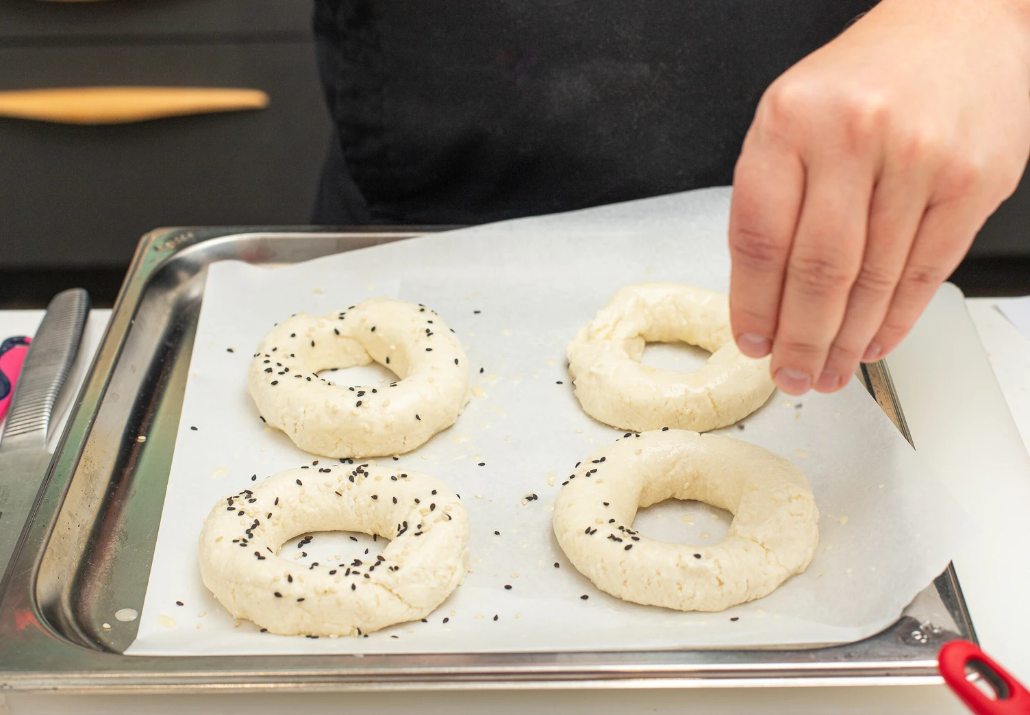 Разогрейте духовку до 170 °C. Противень застелите бумагой для выпечки. Разложите на нём бейглы, оставляя между заготовками свободное пространство не менее 2 см.