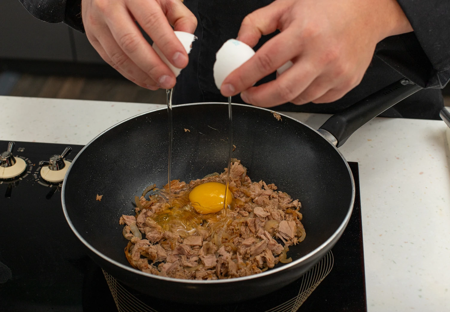Затем вылейте сверху смесь из тунца и двух яиц, перемешайте и оставьте на среднем огне под крышкой на 6–8 минут.