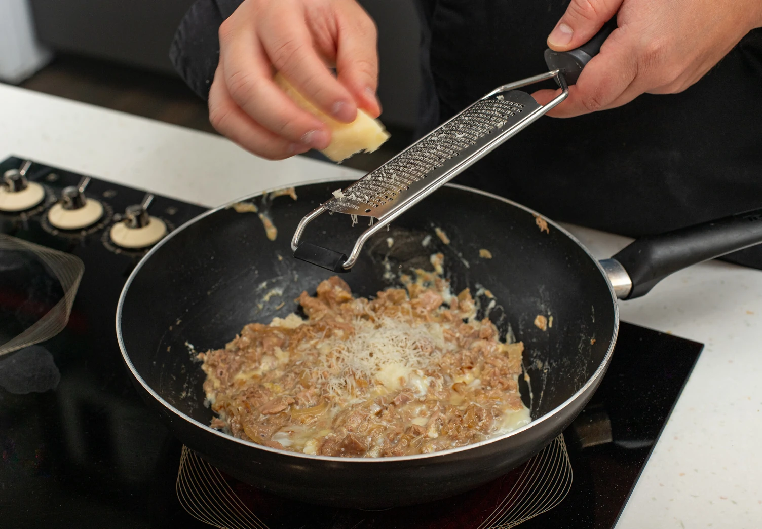Добавьте к смеси тёртый сыр и дайте ему расплавиться.