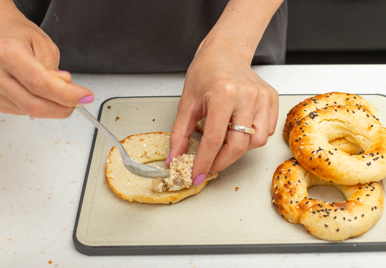 Любите выпечку на завтрак, но следите за питанием? Попробуйте ПП-бейглы по нашему рецепту — без глютена и дрожжей, но с ударной порцией белка: целых 28 г на порцию! Этот рецепт можно использовать как конструктор и менять начинки по настроению: вместо сыра и тунца использовать крем-чиз, авокадо, листья салата, слабосолёную рыбу, яичный салат или бекон.