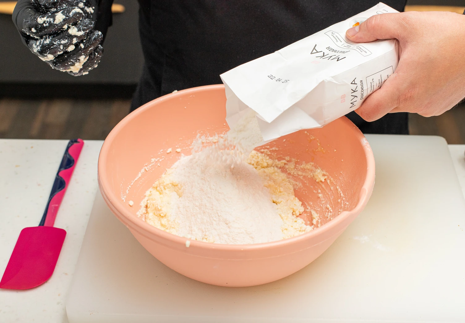 Смешайте рисовую муку с разрыхлителем и всыпьте в миску с творожной массой. Замесите руками пластичное тесто. Накройте его и уберите на 20 минут в холодильник.