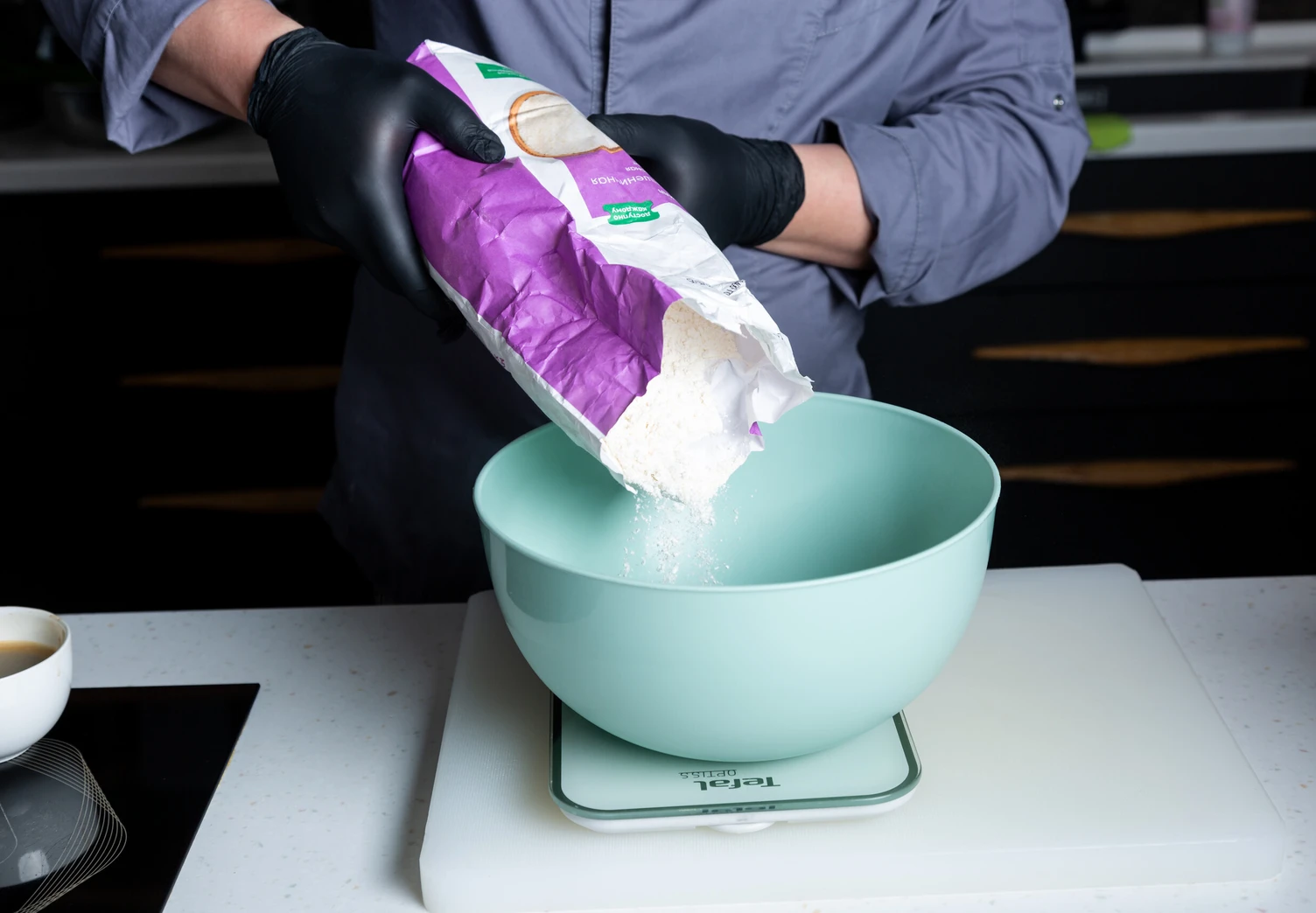 Присыпьте стол мукой, выложите и вымесите тесто. Добавьте растительное масло и ещё раз вымесите. Переложите тесто в миску, накройте и оставьте подходить в тёплом месте.