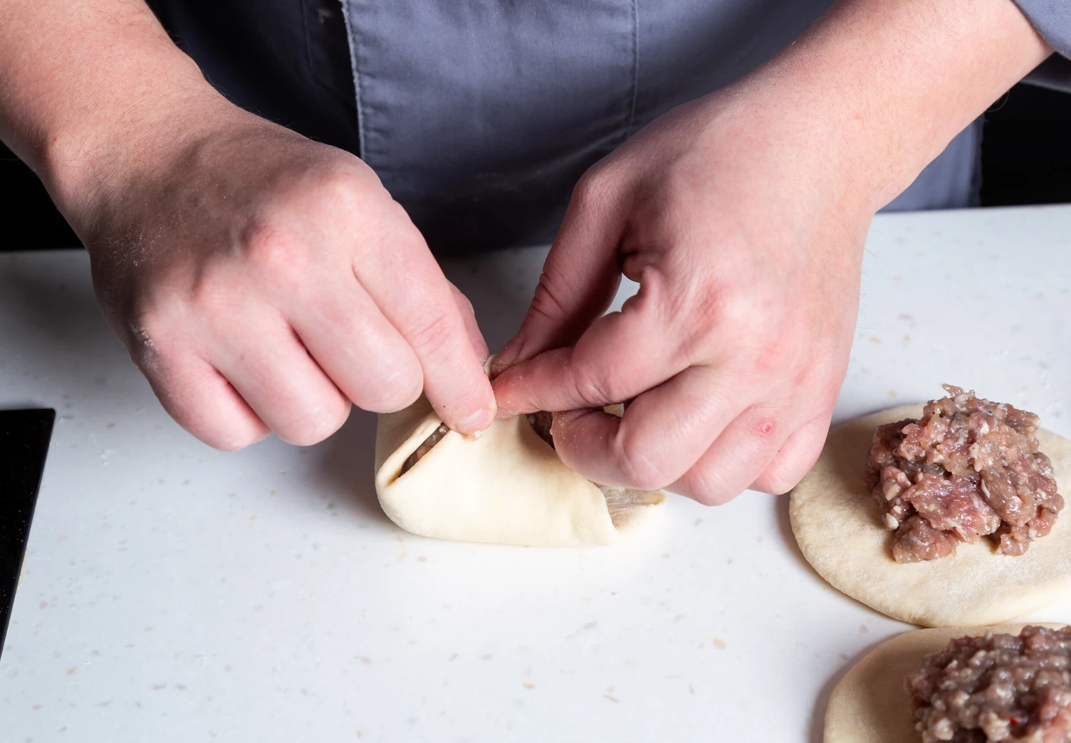 Слегка приплюсните каждый шарик теста рукой, превращая его в небольшую лепёшку. В центр выложите мясную начинку и аккуратно защипните края.