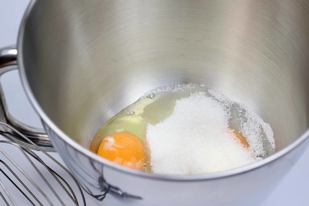 Взбейте яйца с сахаром до пышности 2-3 минуты.