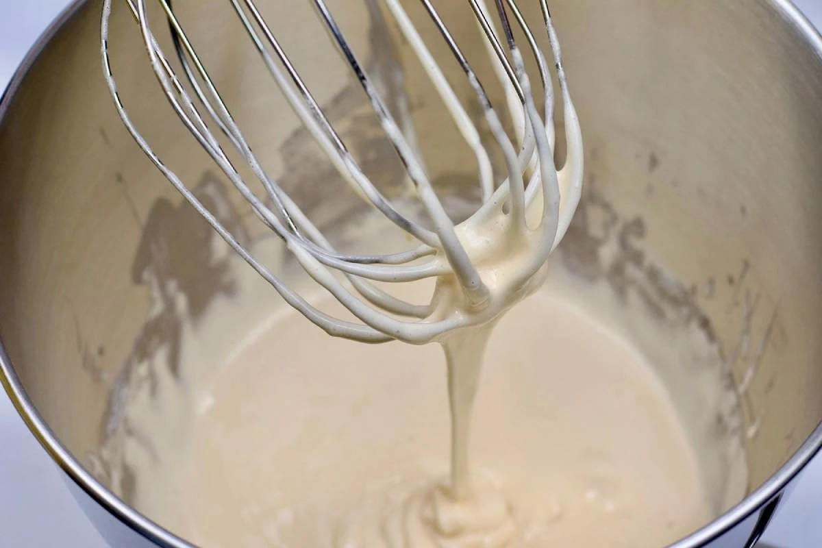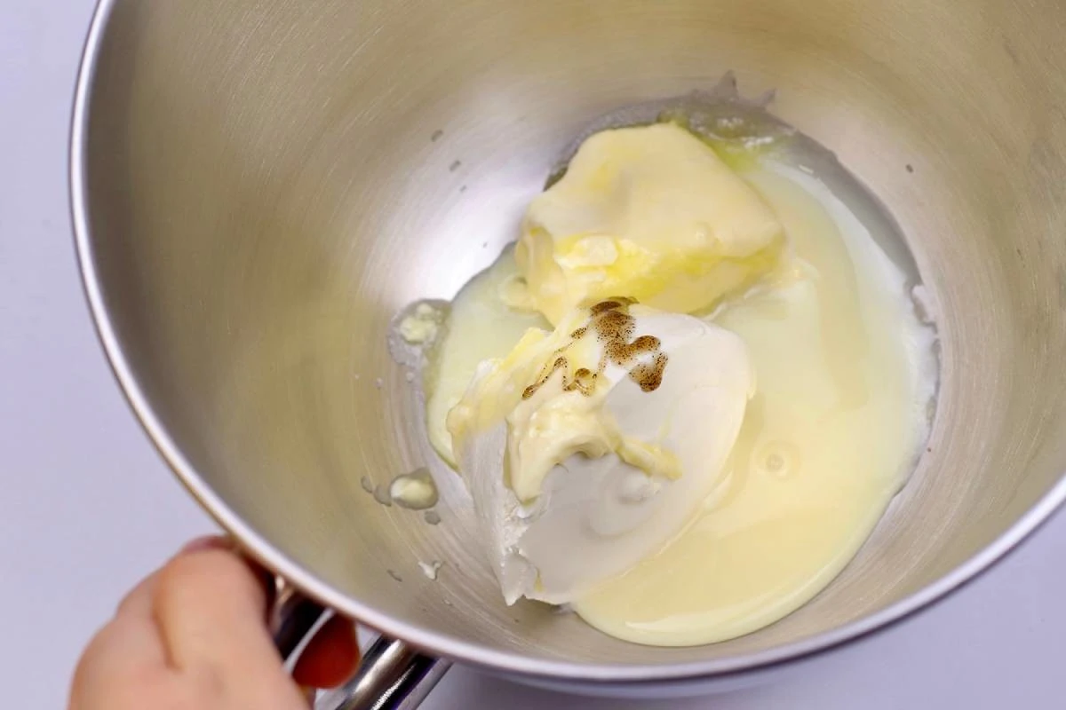 Для крема взбейте сыр, ваниль, сгущённое молоко и размягчённое сливочное масло до однородности.