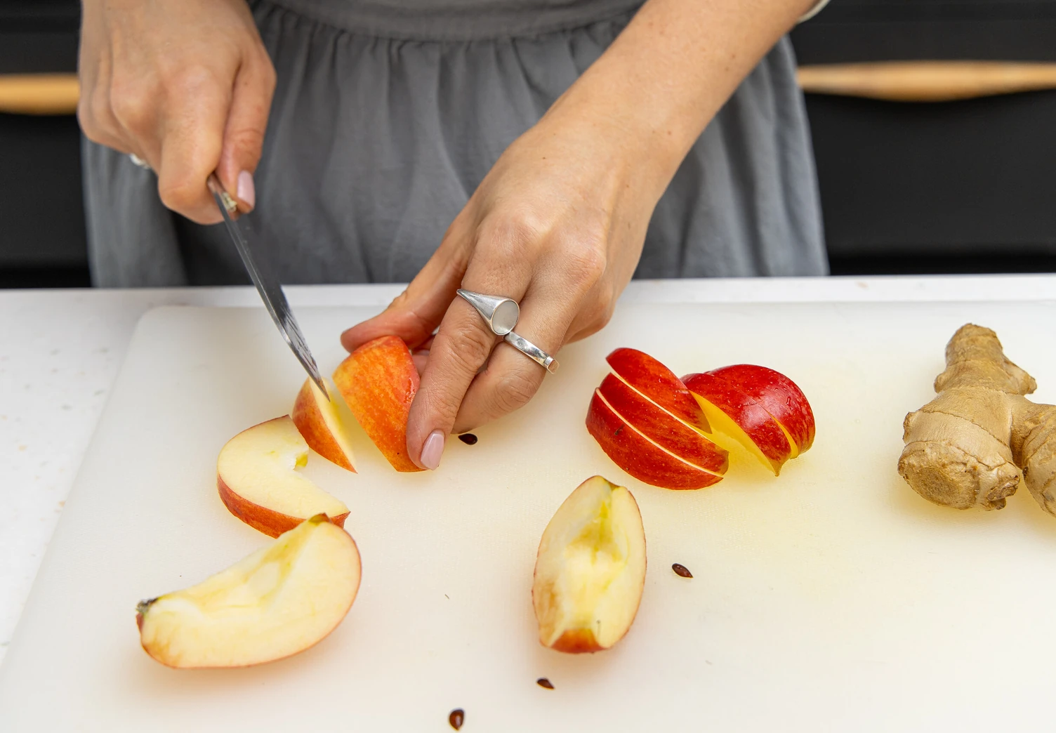 Нарежьте очищенный имбирь кружочками, а апельсин — полукруглыми ломтиками. Из яблока удалите сердцевину и нарежьте его дольками.