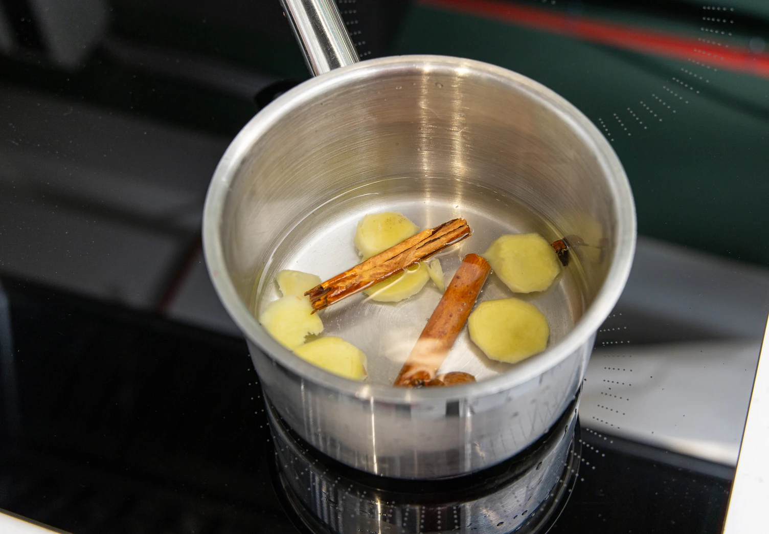Вскипятите воду в сотейнике. Добавьте туда корицу, гвоздику, имбирь и мускатный орех. Прокипятите 1 минуту.