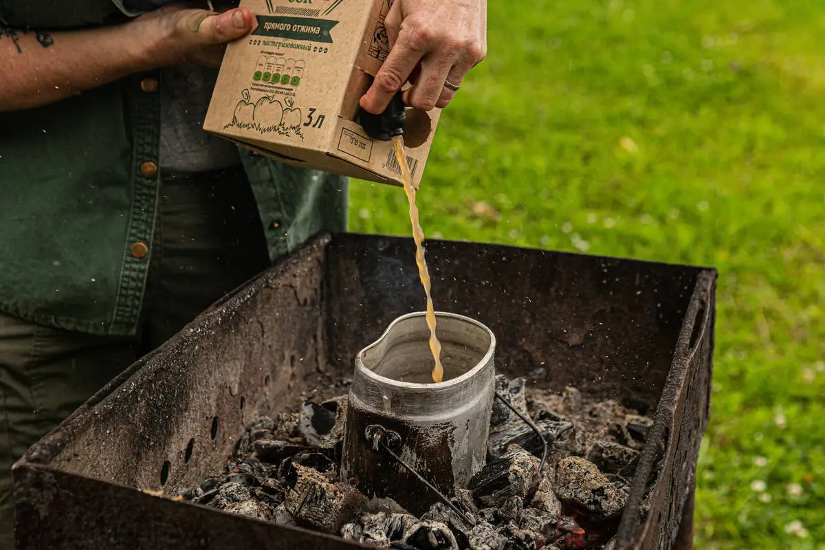 В котелок налейте оба вида сока и установите в горячие угли или повесьте над костром.