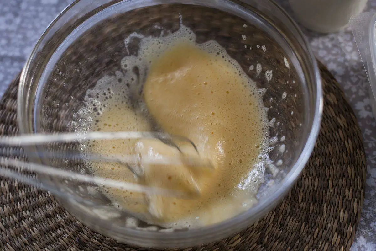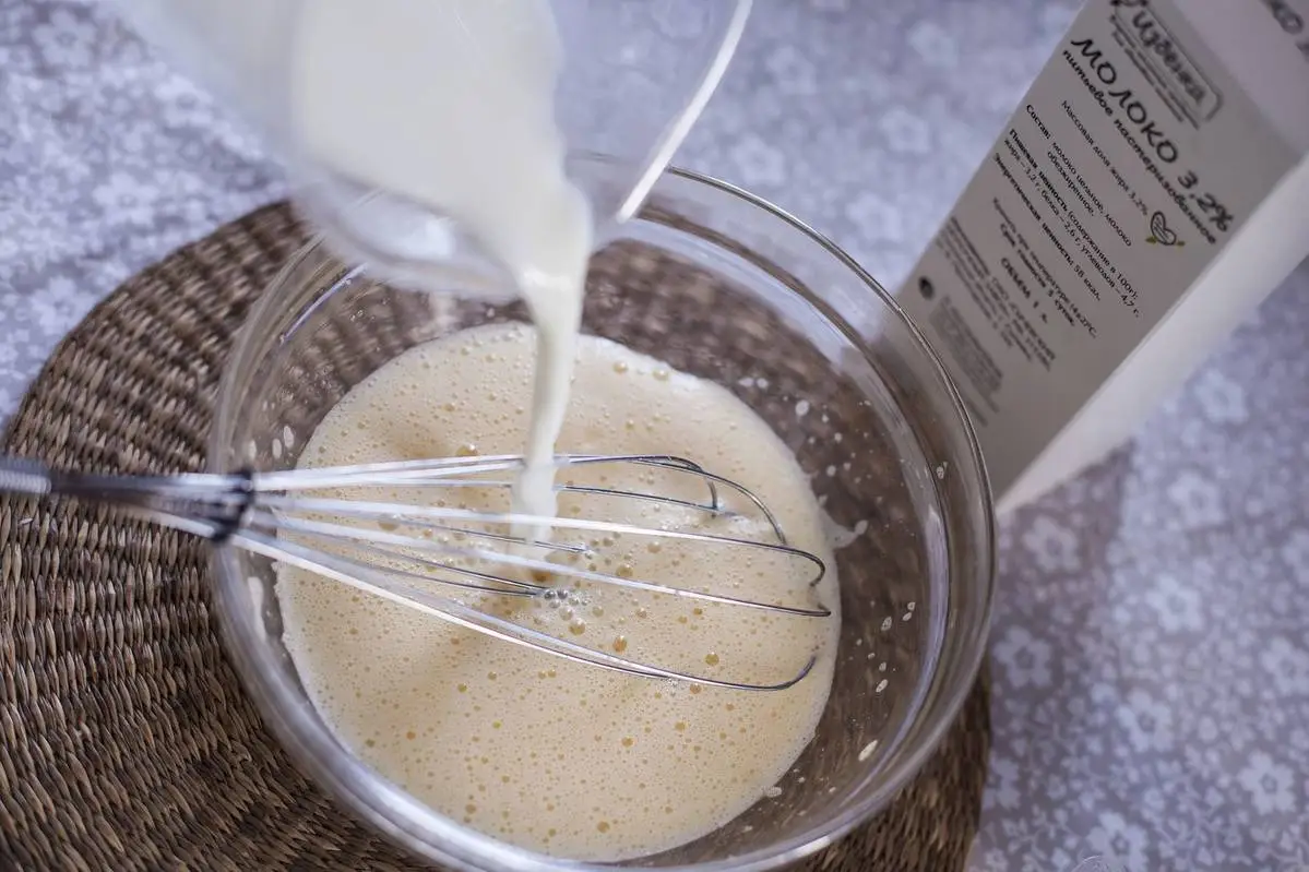 Добавьте теплое молоко, хорошо размешайте.