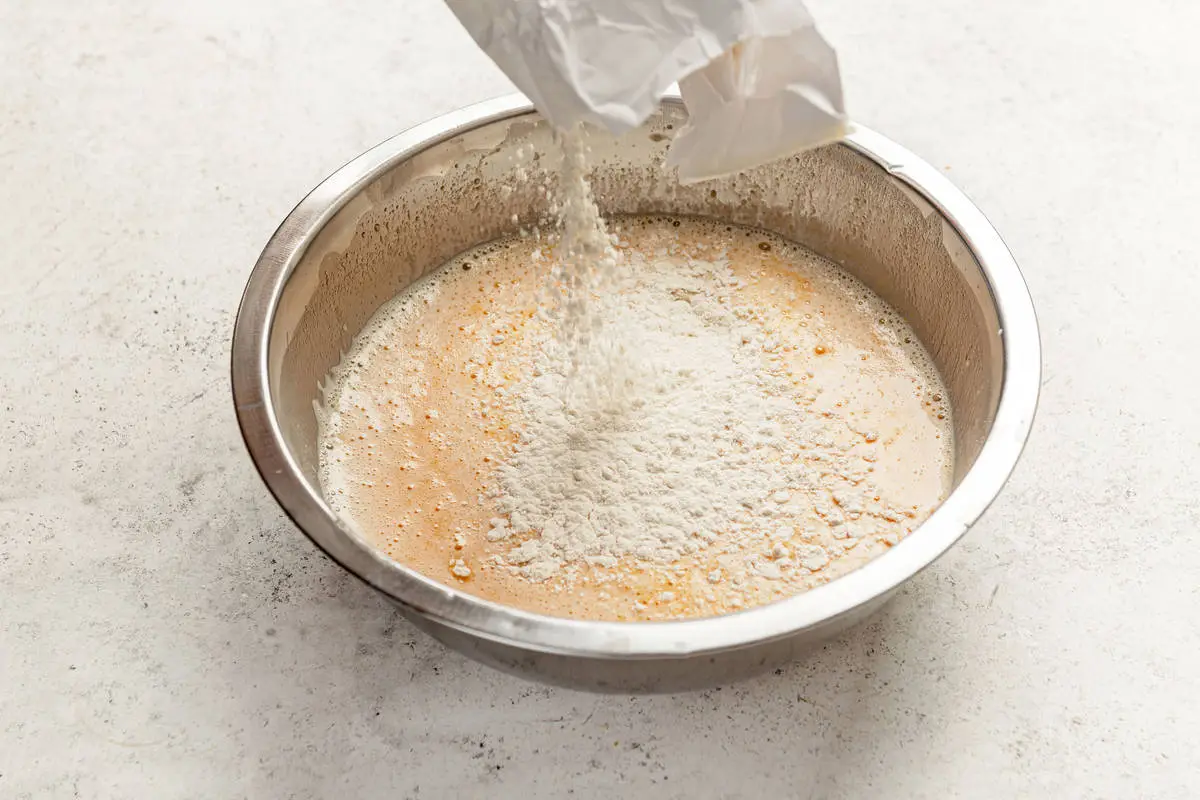 Добавьте 3/4 стакана муки, размешайте, если тесто получилось слишком жидким, добавьте оставшуюся муку. Правильная консистенция теста должна напоминать кефир. Дайте тесту постоять 15-20 минут при комнатной температуре. Добавьте растительное масло в тесто, перемешайте.