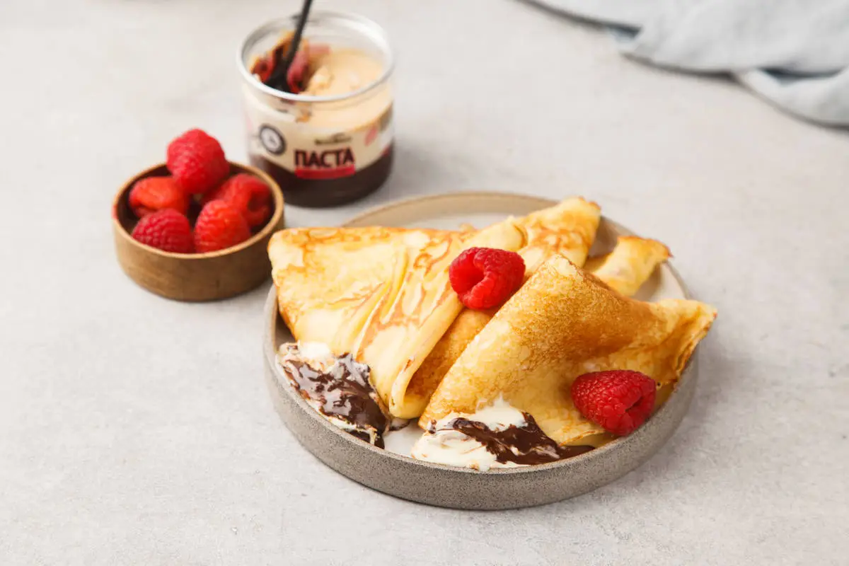 Классические блины на молоке — тонкие и с дырочками. У них довольно нейтральный вкус, поэтому такие блинчики можно фаршировать любыми начинками и подавать с какими угодно соусами. Мы предлагаем сделать десертные блины, добавив к ним шоколадную пасту и микс свежих ягод.