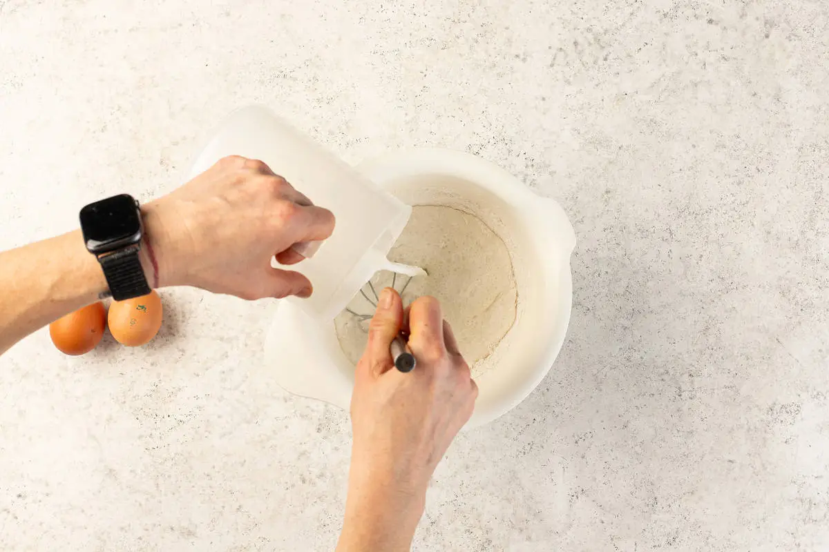Смешайте муку с холодной водой и молоком, добавьте соль и сахар.