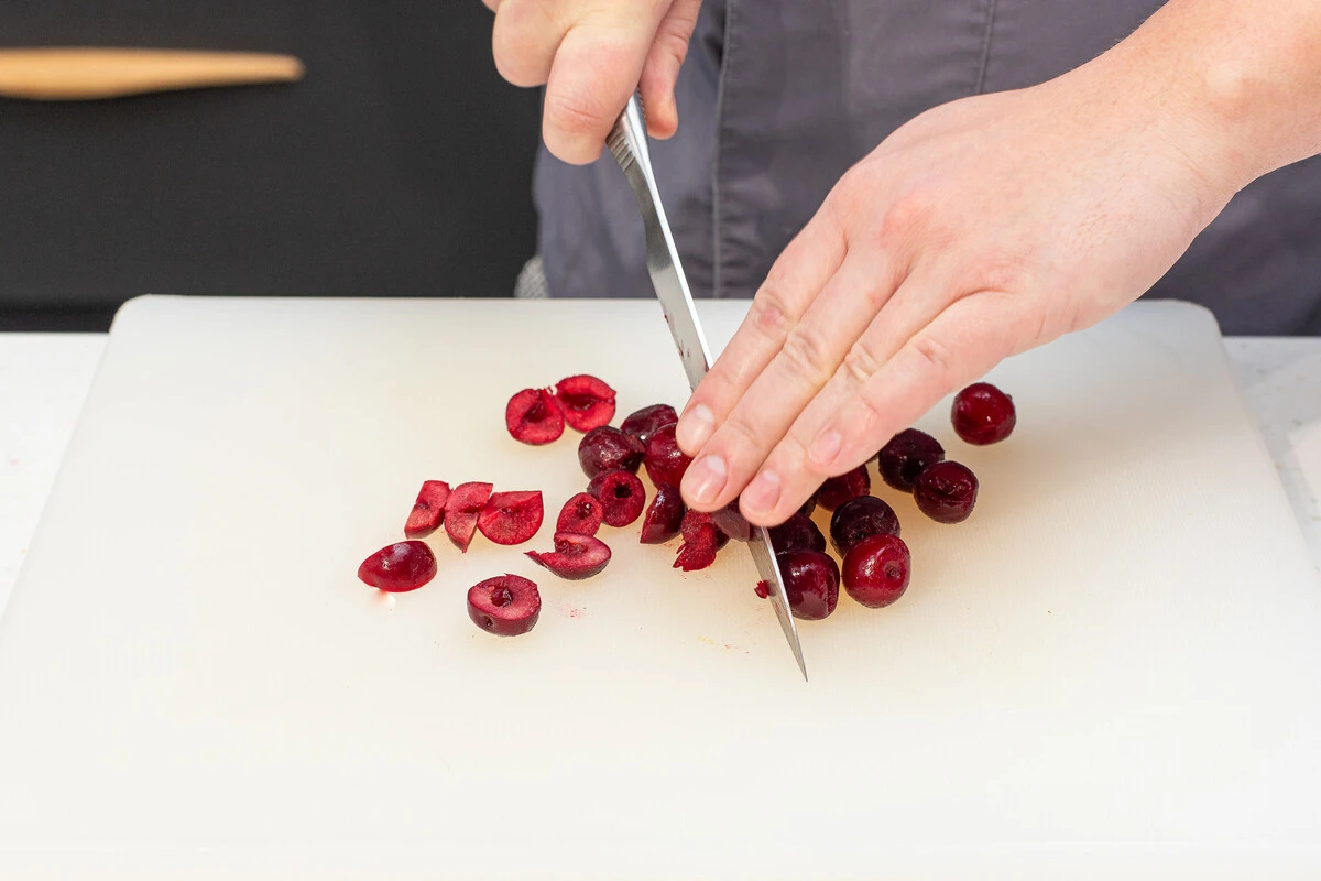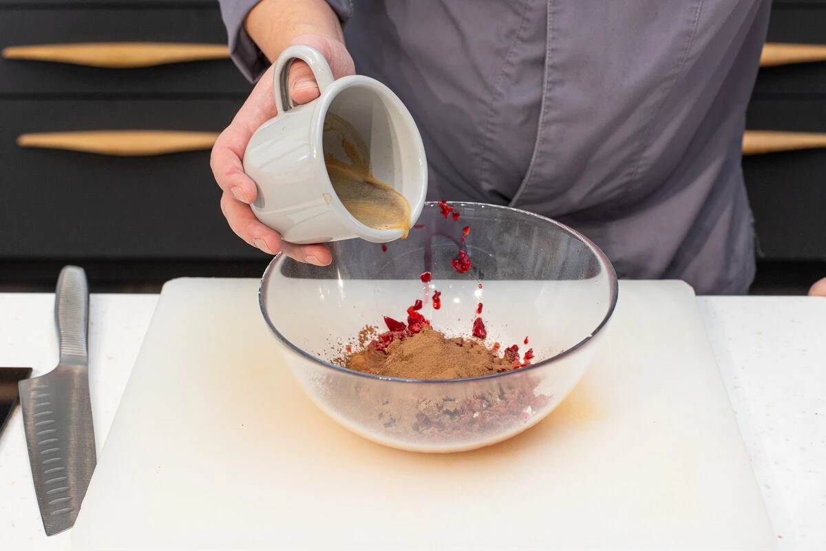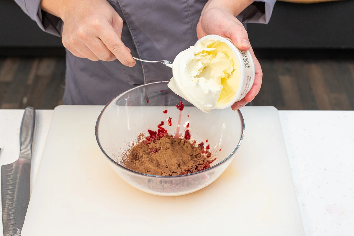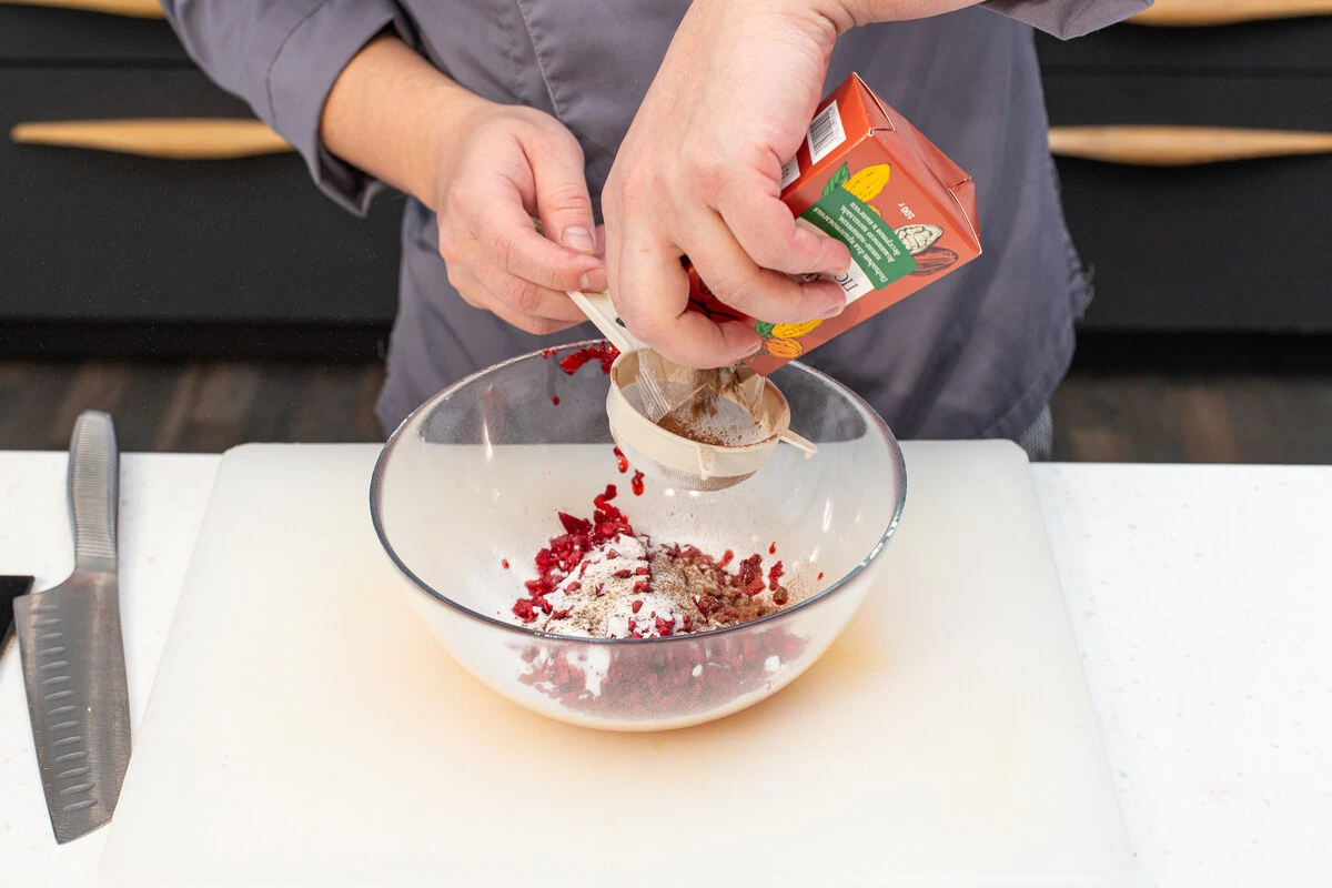 Добавьте к вишне сахарную пудру и какао, перемешайте.