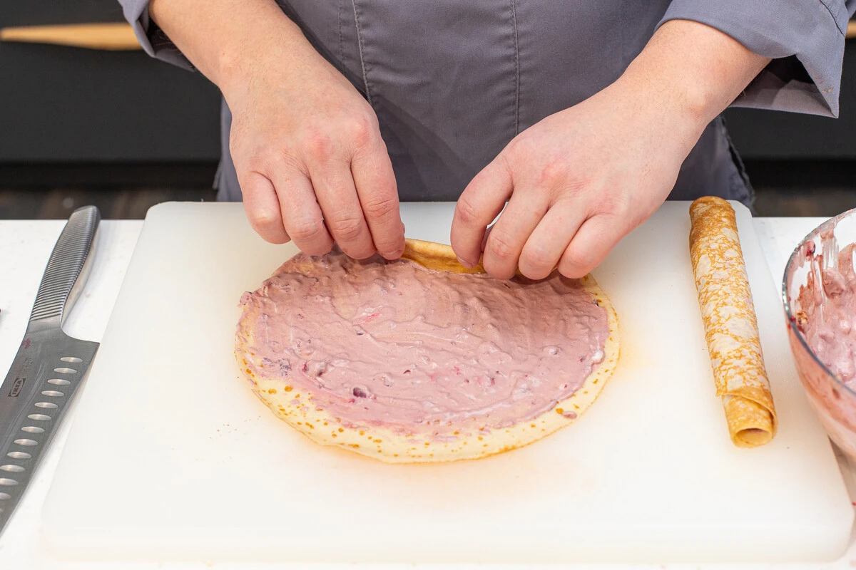 Распределите начинку тонким слоем по каждому блину и сверните их рулетиком.