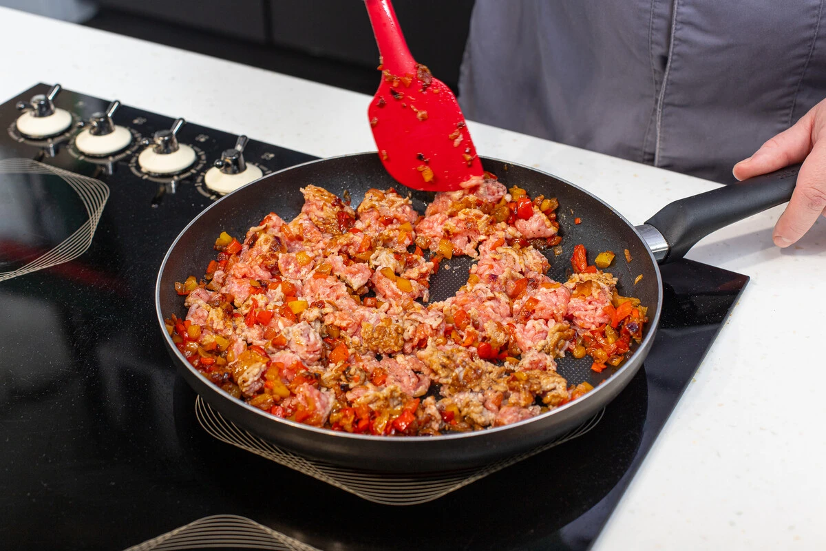 Добавьте к овощам фарш, специи и обжарьте. Затем влейте ещё 150 мл воды и продолжайте готовить до испарения жидкости.