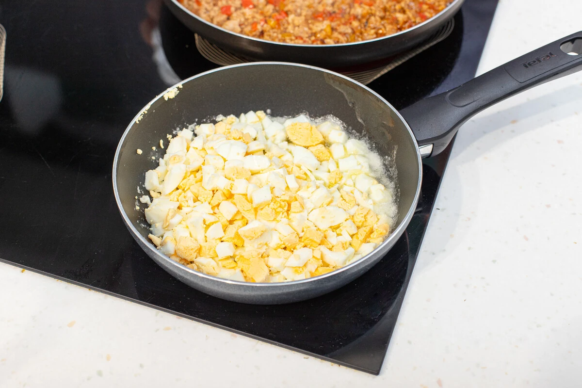 Яйца сварите вкрутую, мелко порубите и слегка обжарьте на сливочном масле.