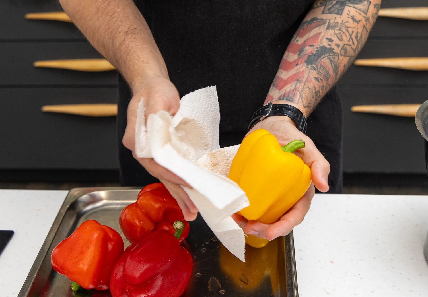 Готовые горячие перцы накройте фольгой и оставьте на 15–20 минут, чтобы остыли и пропарились.