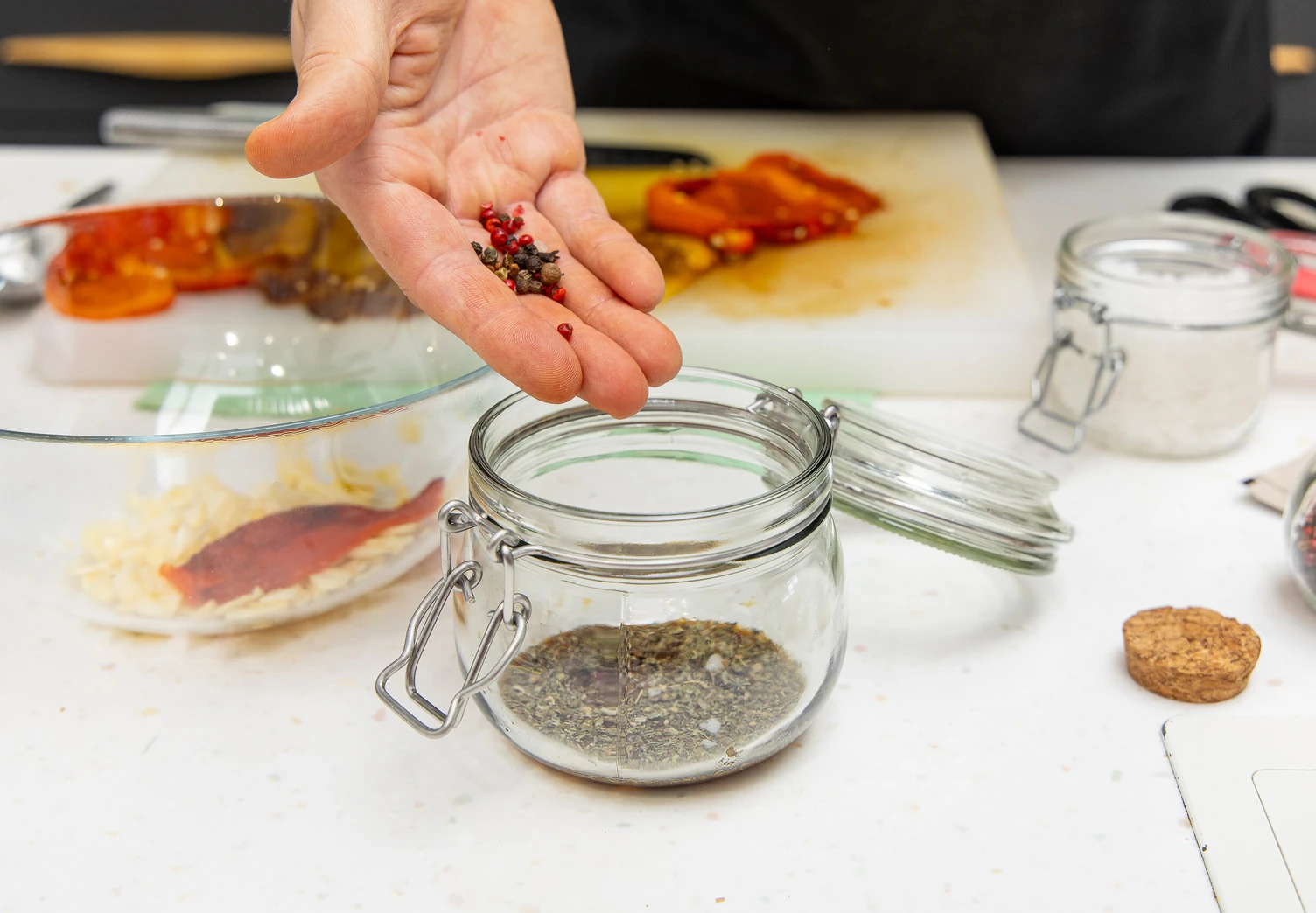 Пока перцы остывают, приготовьте маринад. Для этого смешайте растительное масло, уксус, ароматные травы, молотый перец и соль.
