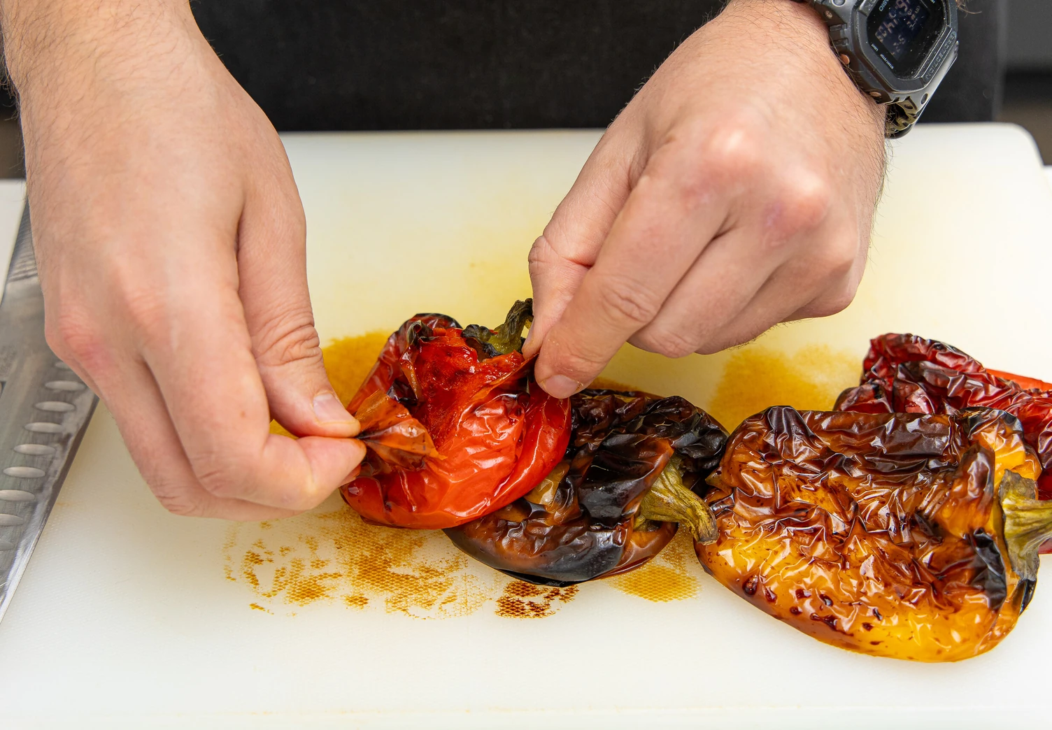 С остывших перцев аккуратно снимите шкурку, держа их за хвостик, а затем удалите семена. Чеснок нарежьте тонкими слайсами и смешайте с перцами.