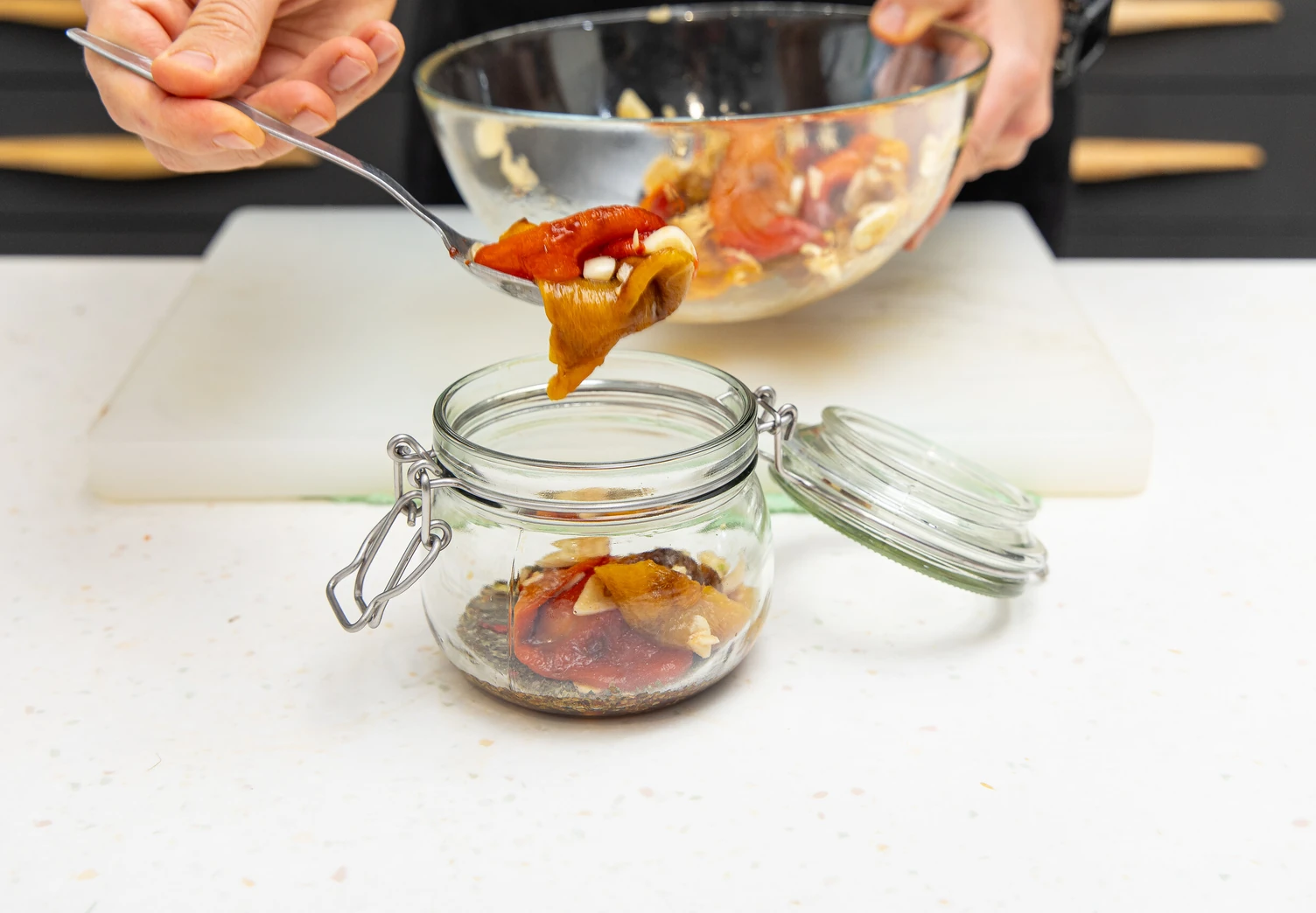 Плотно уложите перцы с чесноком в банку, герметично закатайте её крышкой.