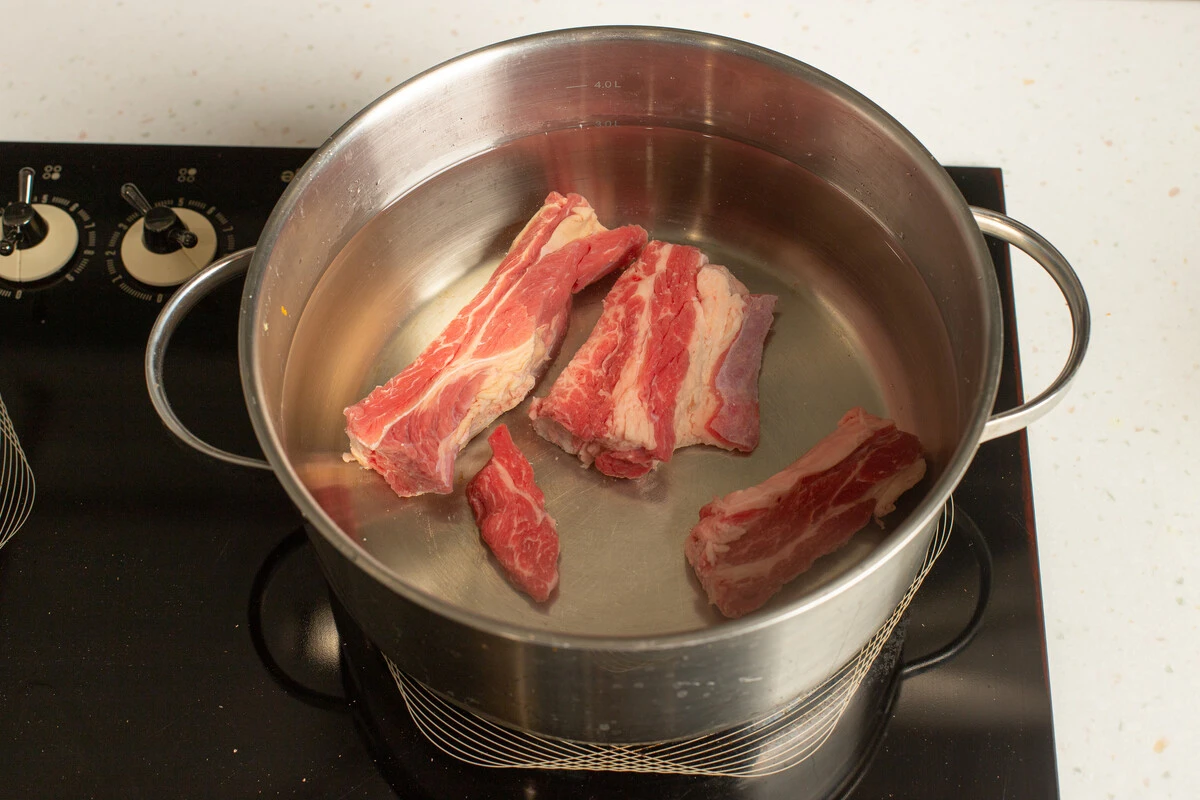 Возьмите не самую маленькую кастрюлю на вашей кухне, так как мало борща нет смысла варить, 5-ти литровая кастрюля вполне подойдёт. Мясо, специи, очищенные луковицу и картофелину положите в кастрюлю с холодной водой.