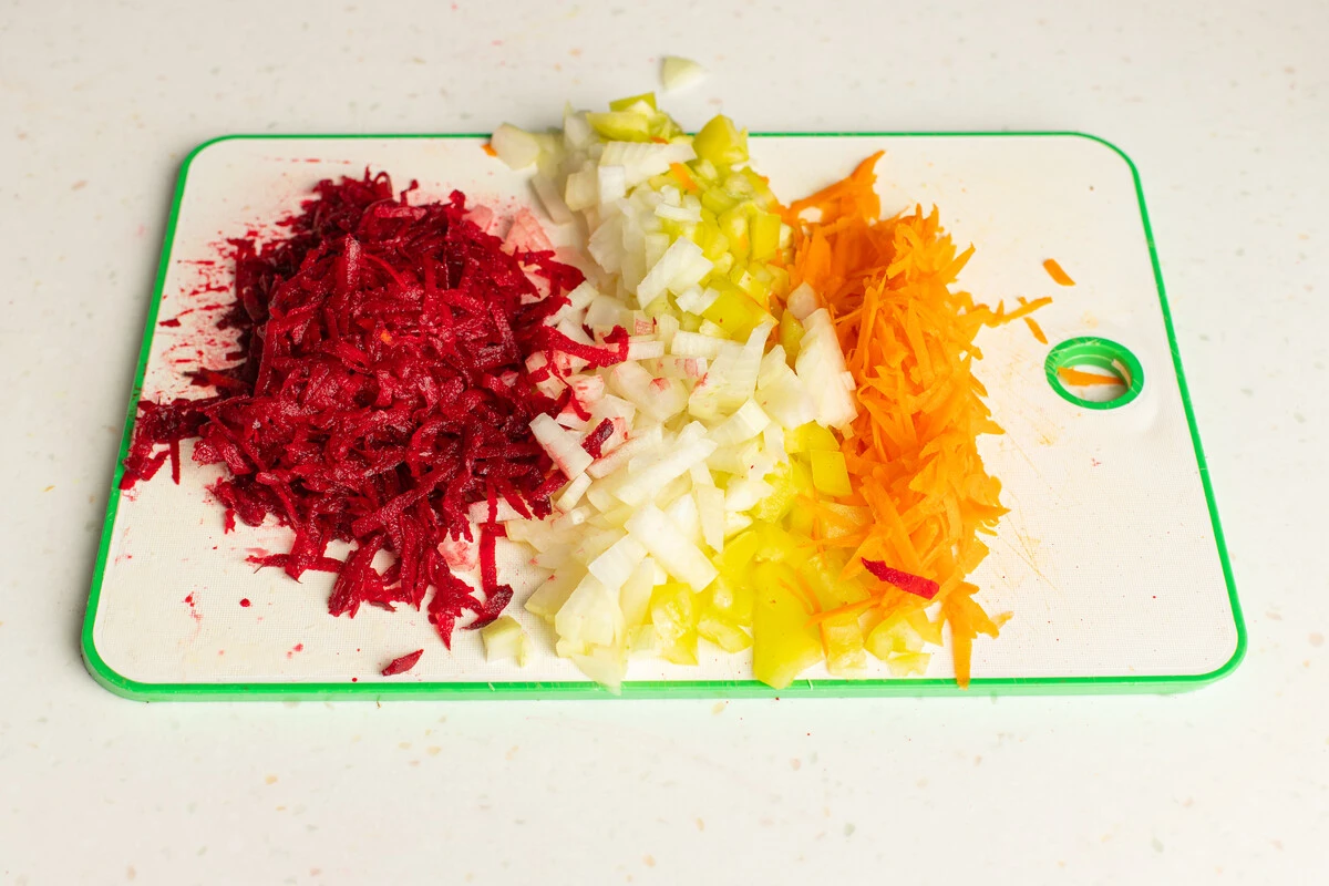Приготовьте зажарку. Мелко нарежьте лук кубиками, перец — полукольцами, почистите и натрите свёклу и морковь.