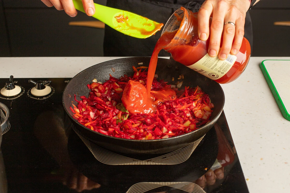 Обжарьте лук и перец в небольшом количестве растительного масла. Добавьте сливочное масло, положите в сковороду морковь, свёклу и очищенные томаты.