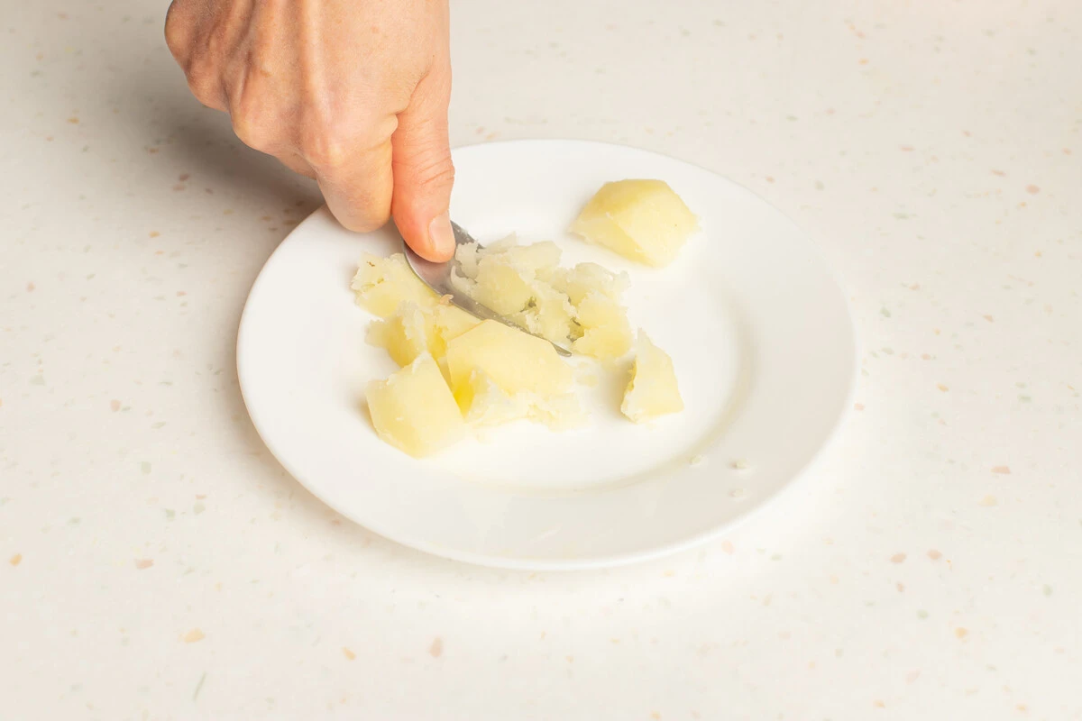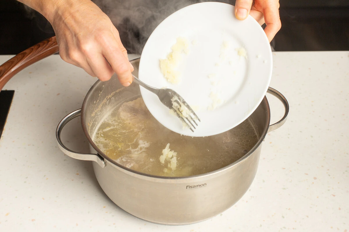 Достаньте из бульона целую картофелину, разомните вилкой.